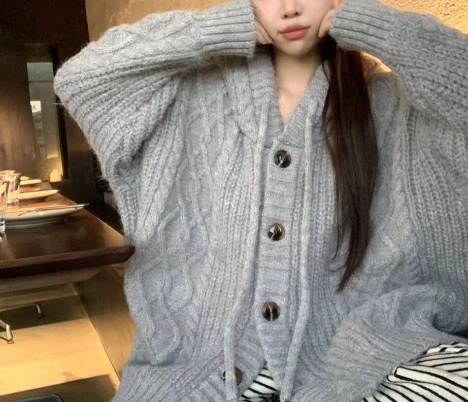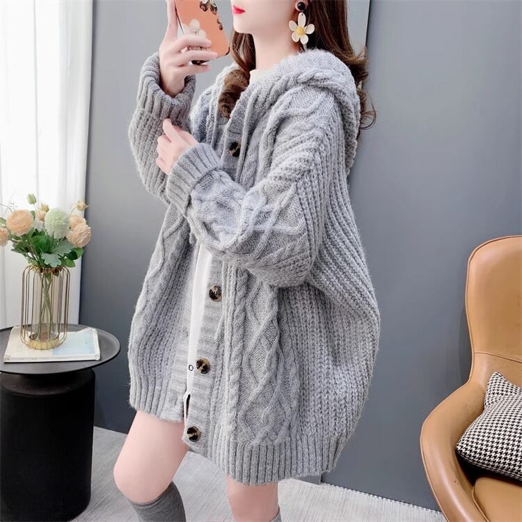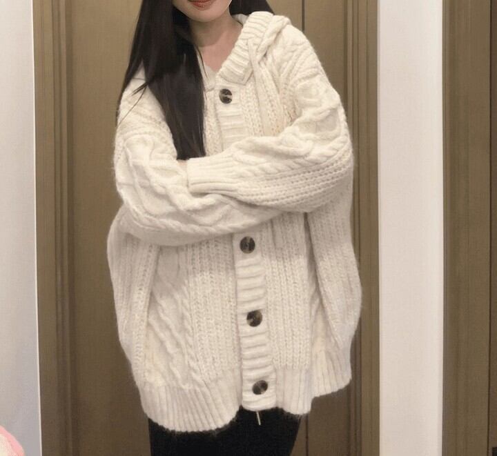 立体感のあるケーブル編みと、フード付きのデザインで
