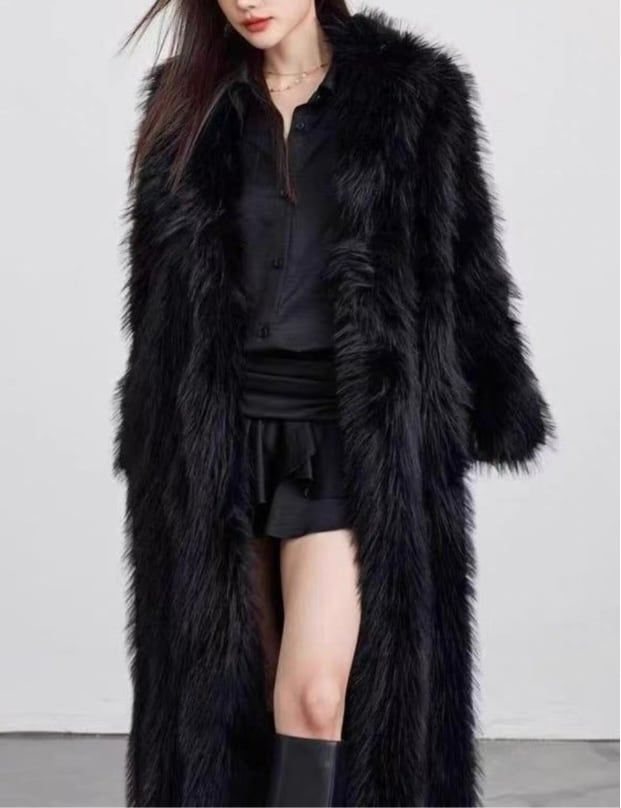 足元まで流れるスーパーロング丈が、縦ラインを強調しスタイルアップ。