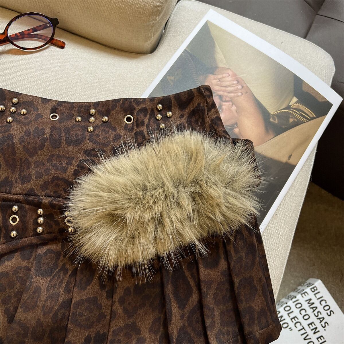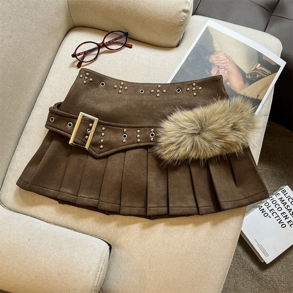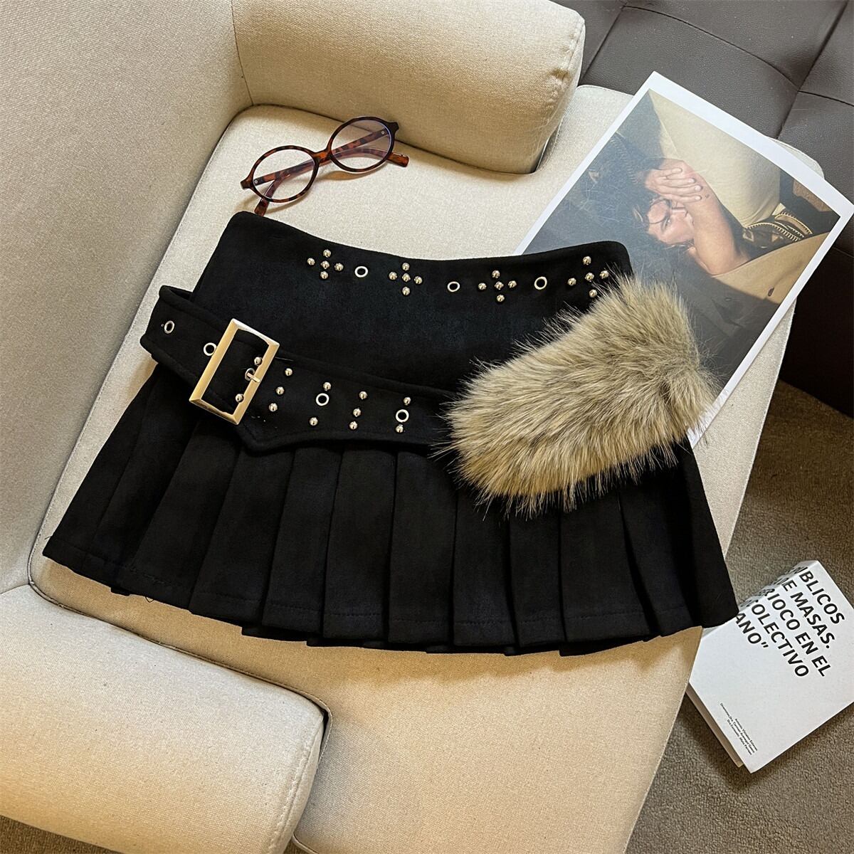 トレンドのY2Kファッションを象徴する、エッジの効いた主役級ミニスカート。 存在感のある太ベルト、煌びやかなスタッズ、そして柔らかなフェイクファーを組み合わせた、甘辛ミックスなデザインが魅力です。