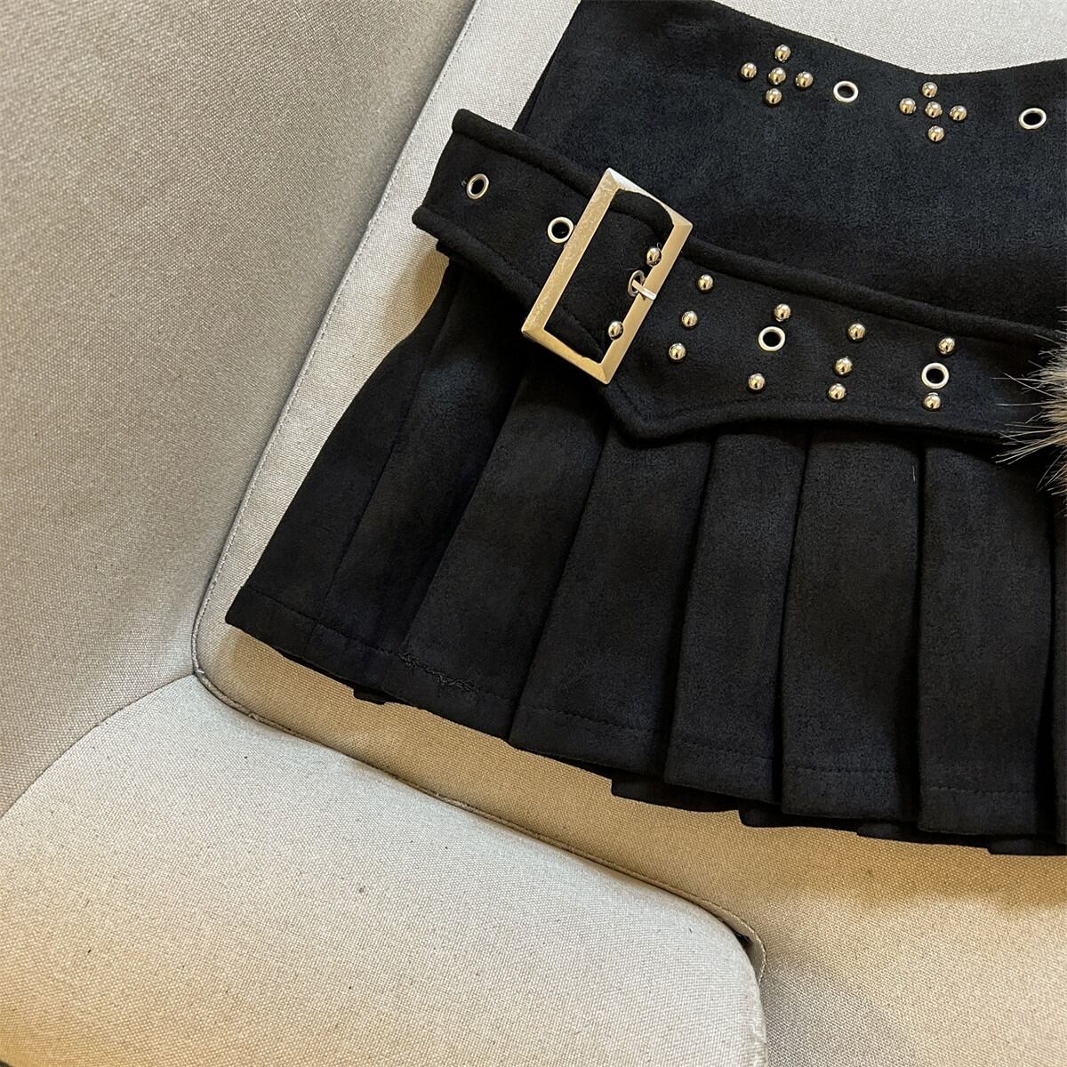 <3Color>ファー&スタッズ付 ベルトプリーツミニスカート M3 -0019