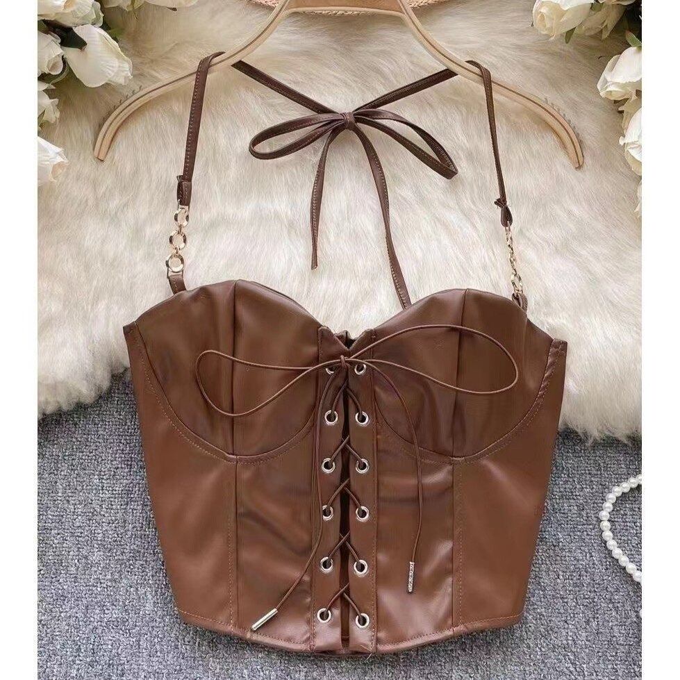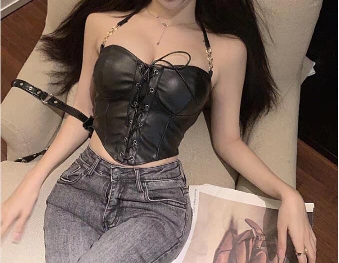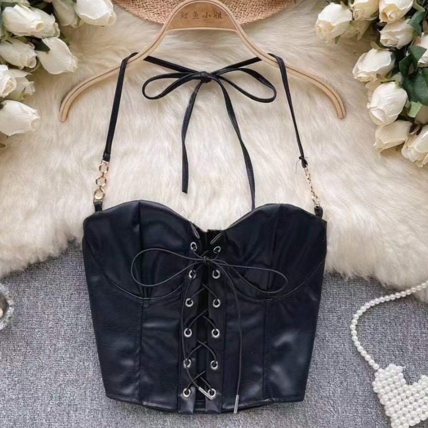 艶やかなフェイクレザーとゴールドチェーンのストラップが放つ、スパイシーで高級感のある一着。 ボディラインを強調するコルセットデザインが、圧倒的な「強め」の女性らしさを演出します。