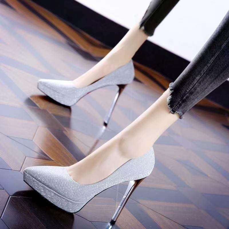 一歩歩くたびに宝石のように煌めく、主役級のグリッターパンプス。 圧倒的なヒール高で、どんなコーデも一瞬で勝負スタイルに格上げ。シャープなポインテッドトゥと、メタリックなヒールの質感が、セクシーで都会的な印象を与えます。