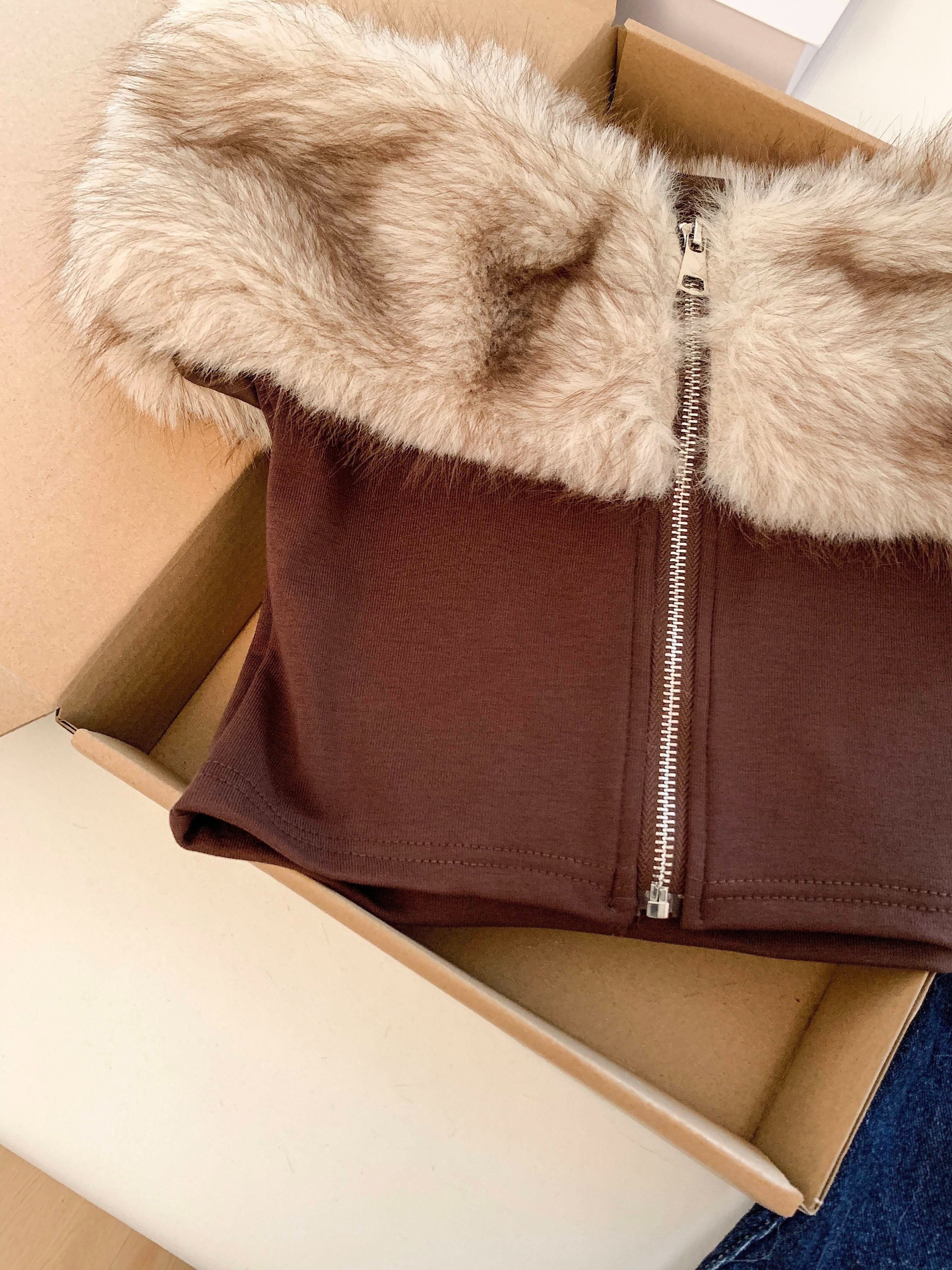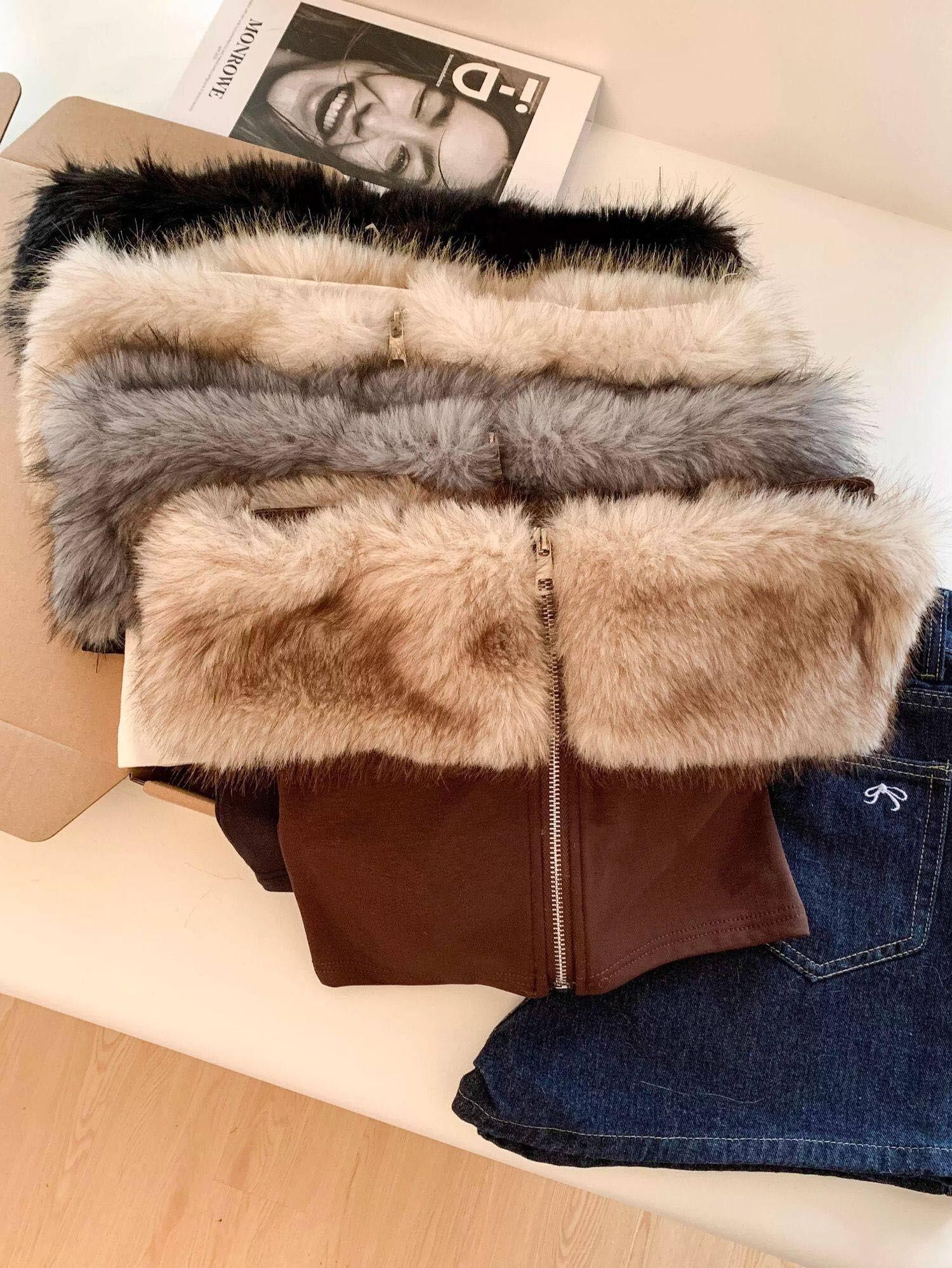 【これ一枚で“強めセクシー”が完成!贅沢ボリュームファーTOPS】 今シーズンのトレンド、フロントジップとボリューミーなファーを組み合わせた、圧倒的に映えるベアトップが登場! 視線を独り占めするゴージャスなルックス。センターのジッパーが辛口なアクセント。開け具合を調節して、自分好みのセクシーさを演出できます。