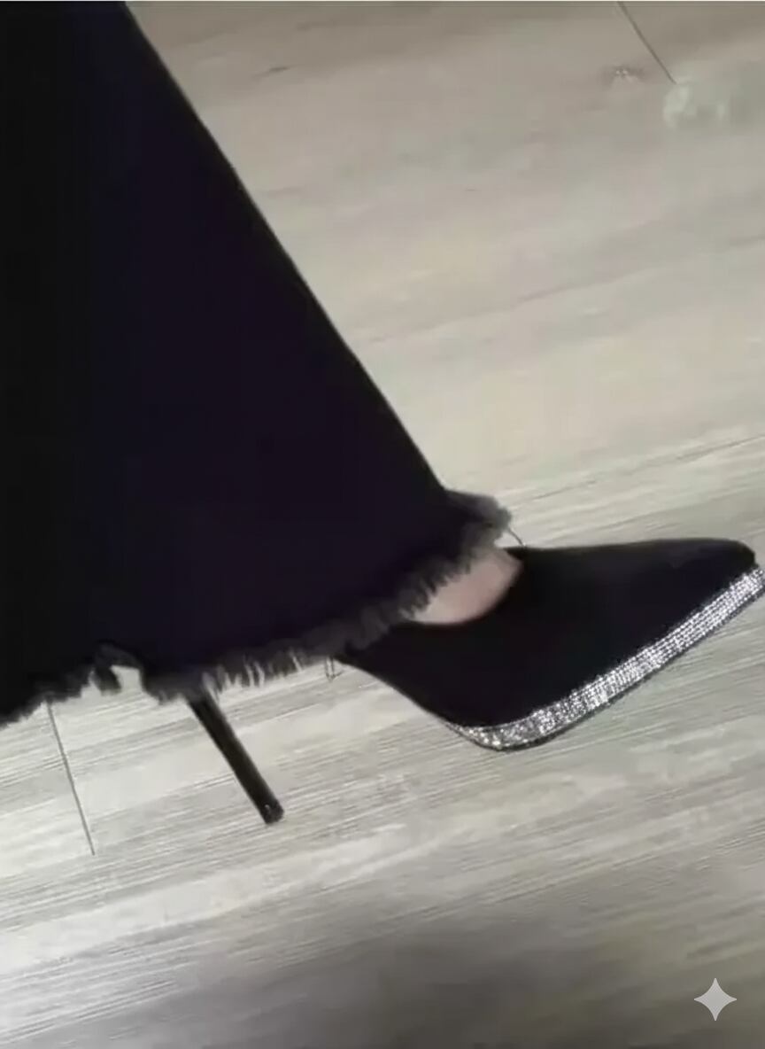 マットなブラックスエードに、ソールを縁取る贅沢なクリスタルビジューが映えすぎてヤバい♡ シュッとしたポインテッドトゥと、高めのピンヒールで脚長効果を最大限に。スキニーデニムでもタイトワンピでも、履くだけでスタイルアップ確定!