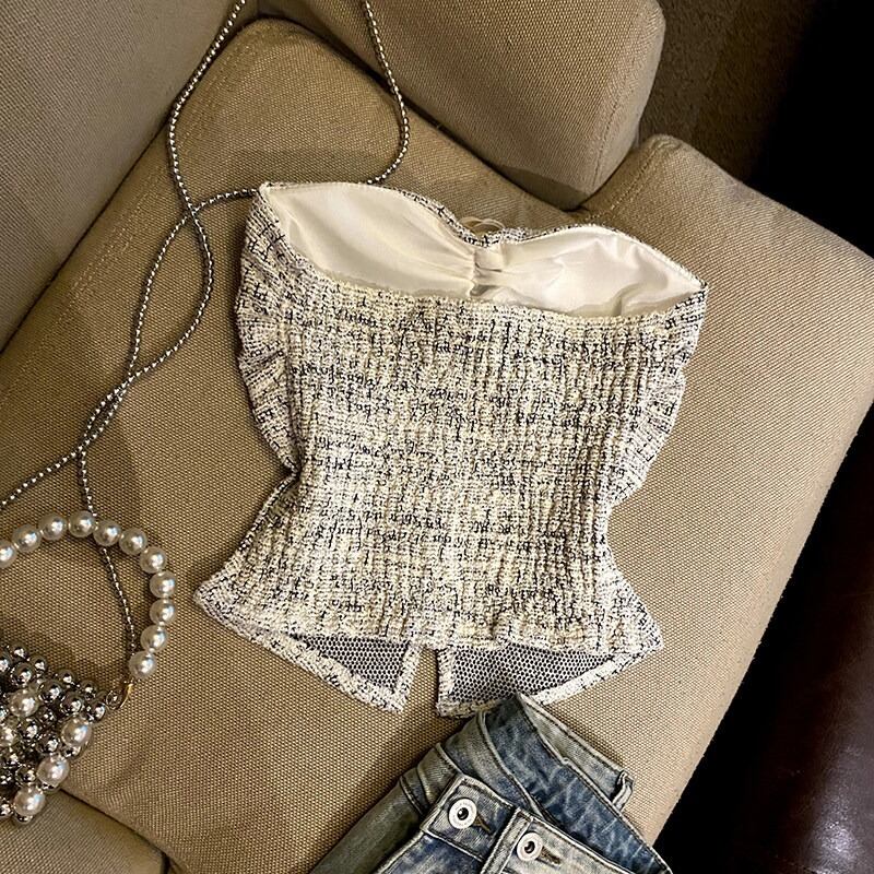 インポート感漂う上質なツイード生地を使用した、主役級のベアトップビスチェです。 胸元に配された立体的なカメリアが、クラシックかつラグジュアリーな雰囲気を格上げ。バストラインを綺麗に見せる立体裁断で、ヘルシーな肌見せを大人っぽく楽しめます。ニュアンスのある混色ツイードが、奥行きのあるリッチな質感を演出。