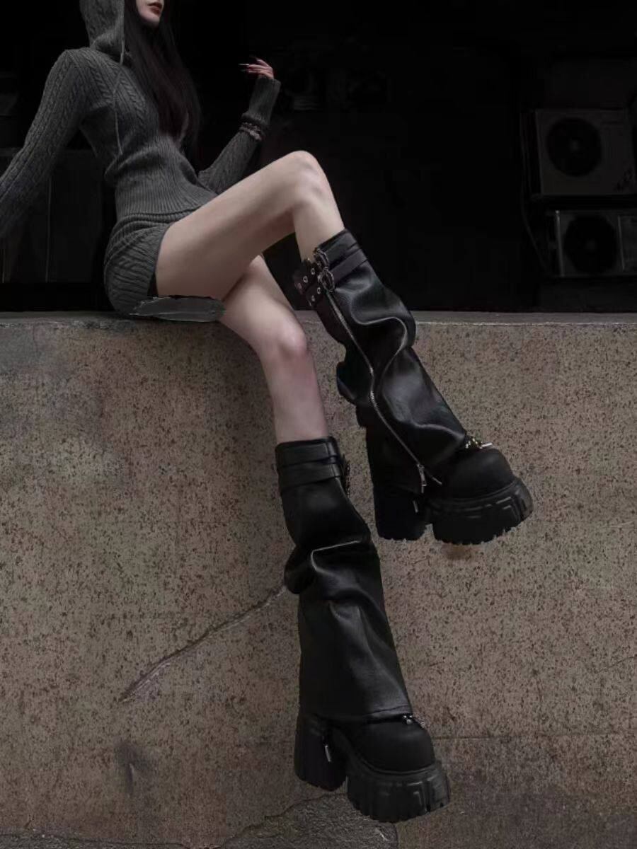手持ちの厚底シューズやスニーカーに重ねるだけで、圧倒的な存在感を放つ**フェイクレザー・ブーツカバー(レッグウォーマー)**が登場。