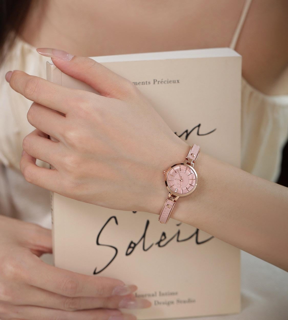 細身のベルト部分には、ステッチを模した高級感のあるディテールが施され、文字盤のトップに輝く一粒のクリスタルがさりげなくクラス感を演出します。