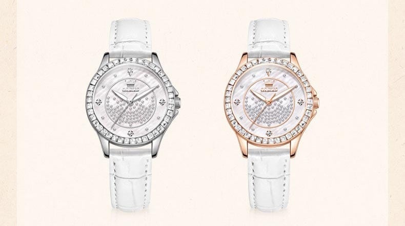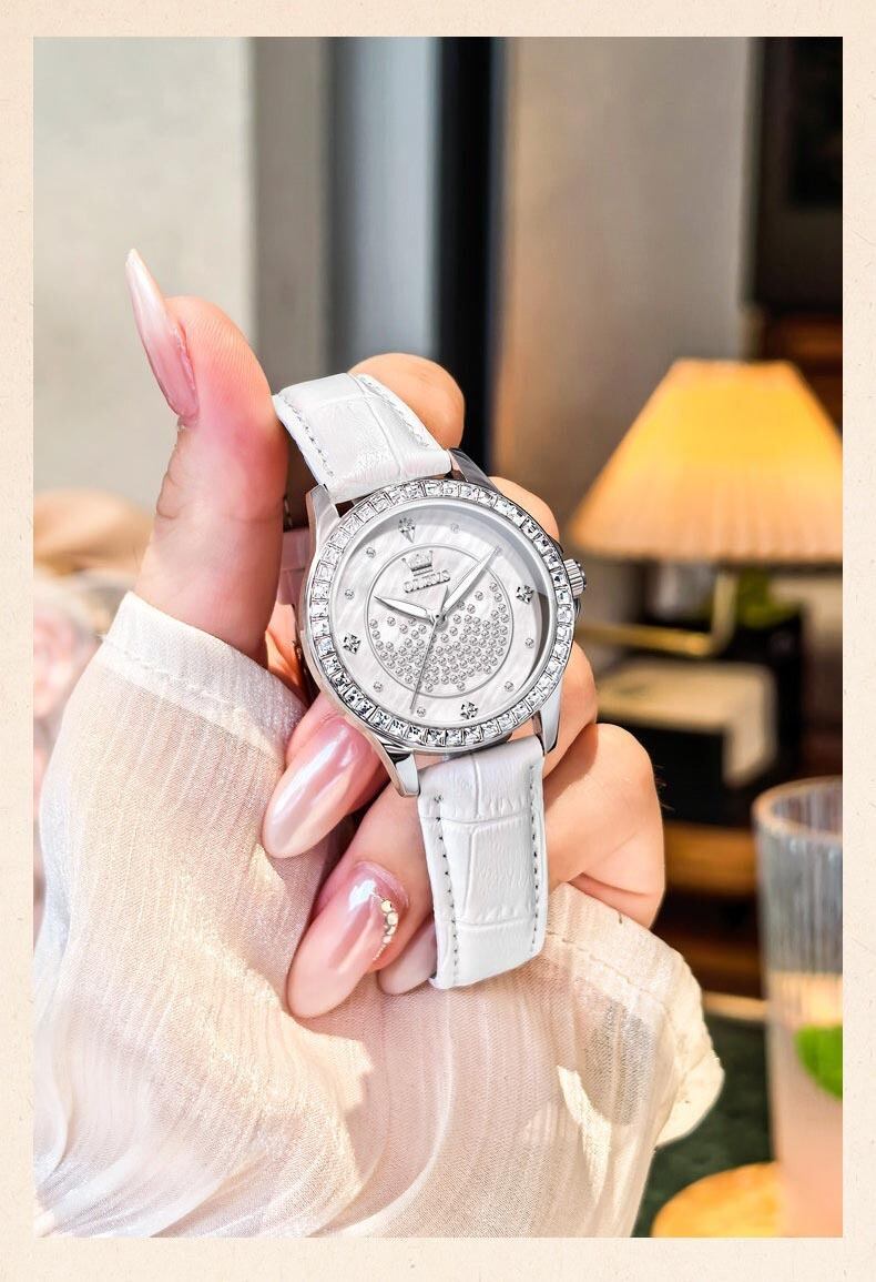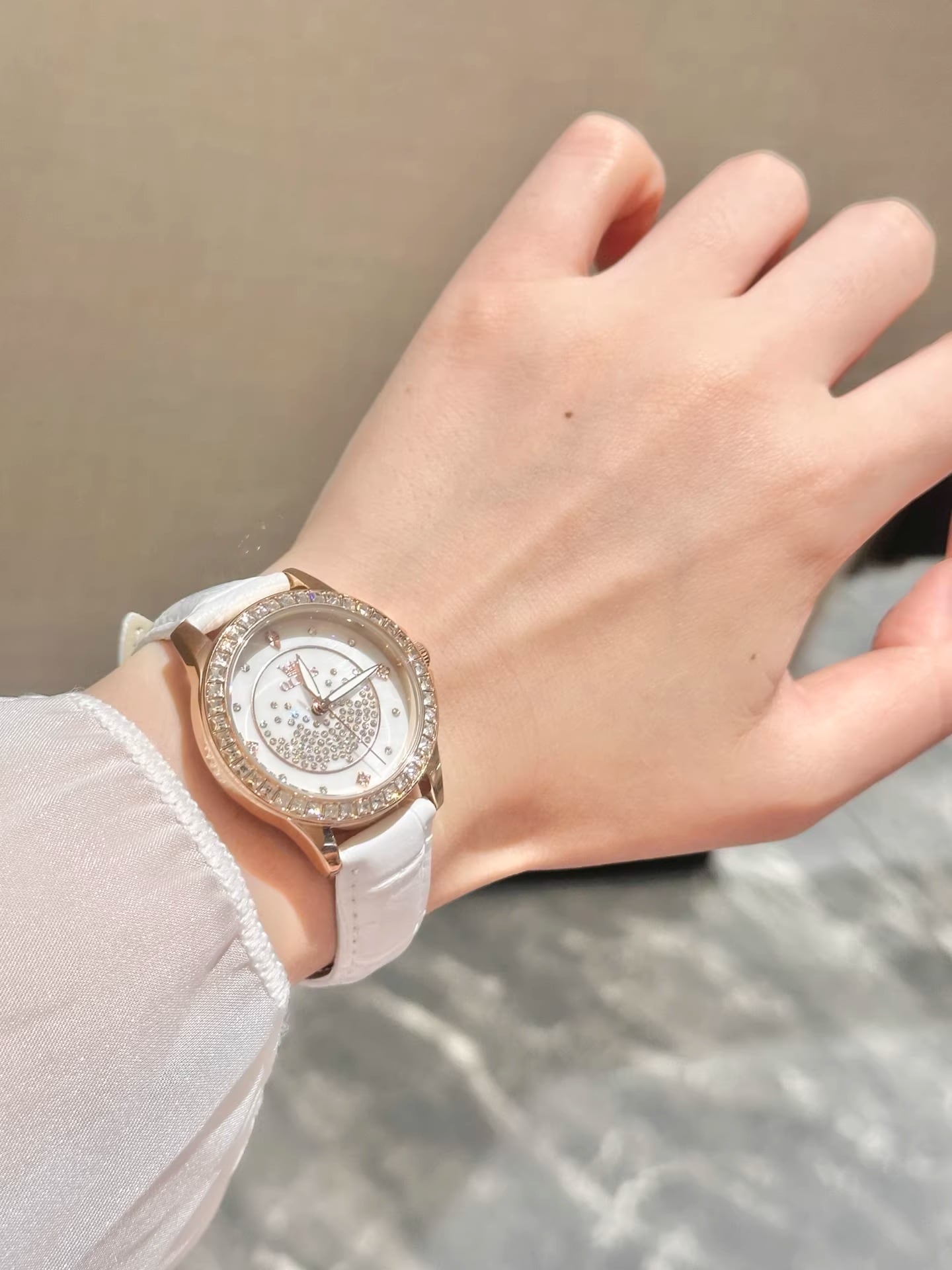 贅沢な輝きのベゼル&文字盤 ダイヤのように煌めく大粒のストーンを贅沢に配置。さらに文字盤下部にもクリスタルを散りばめ、どこから見ても「高見え」を約束します。