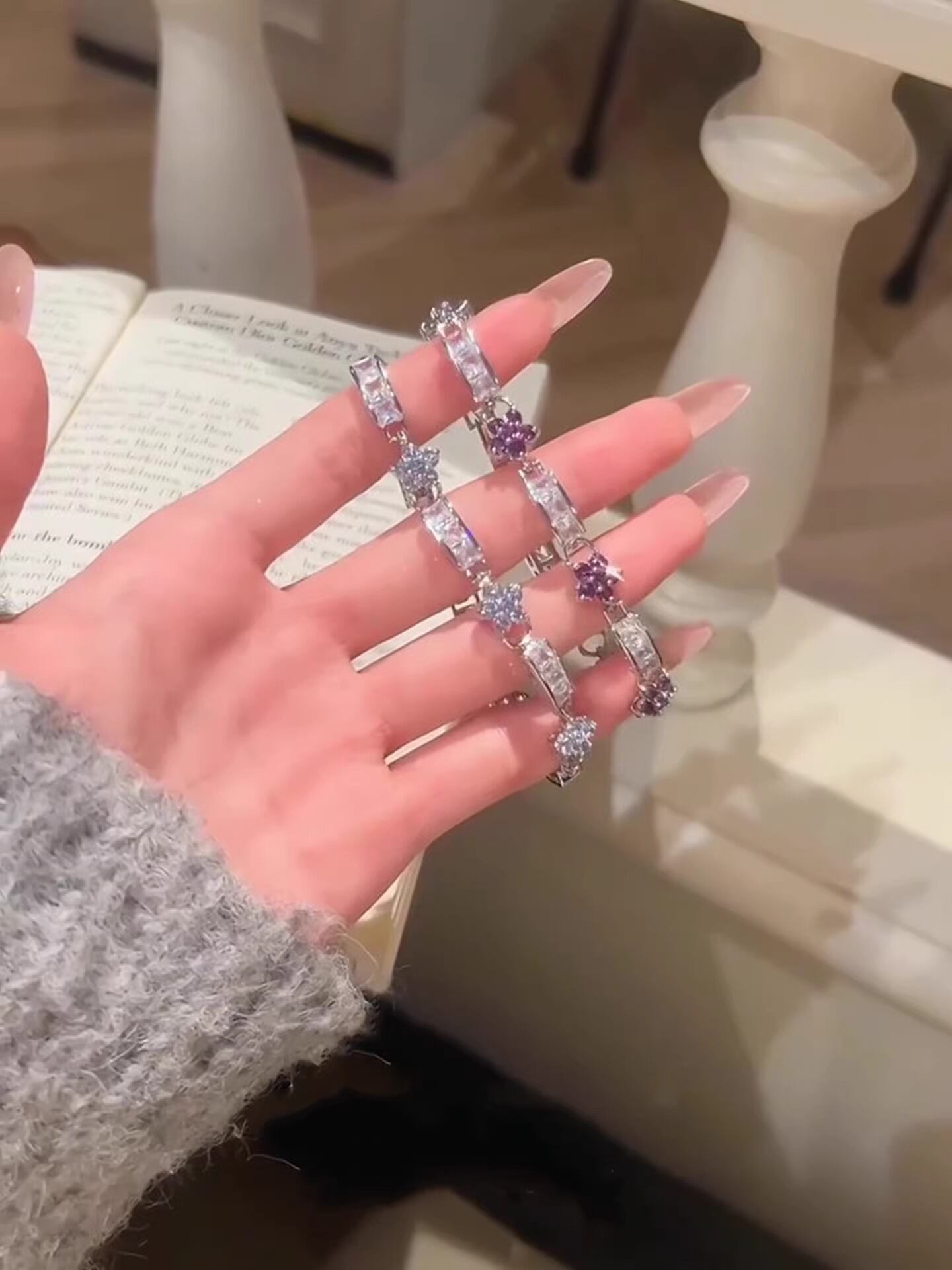 大粒のクリアパーツと、上品に色づくフラワービジューのコンビネーション 。どの角度から見ても隙のない輝きは、まさに「大人の遊び心」を体現したデザイン。