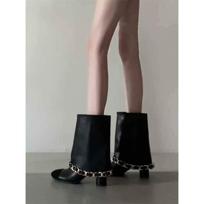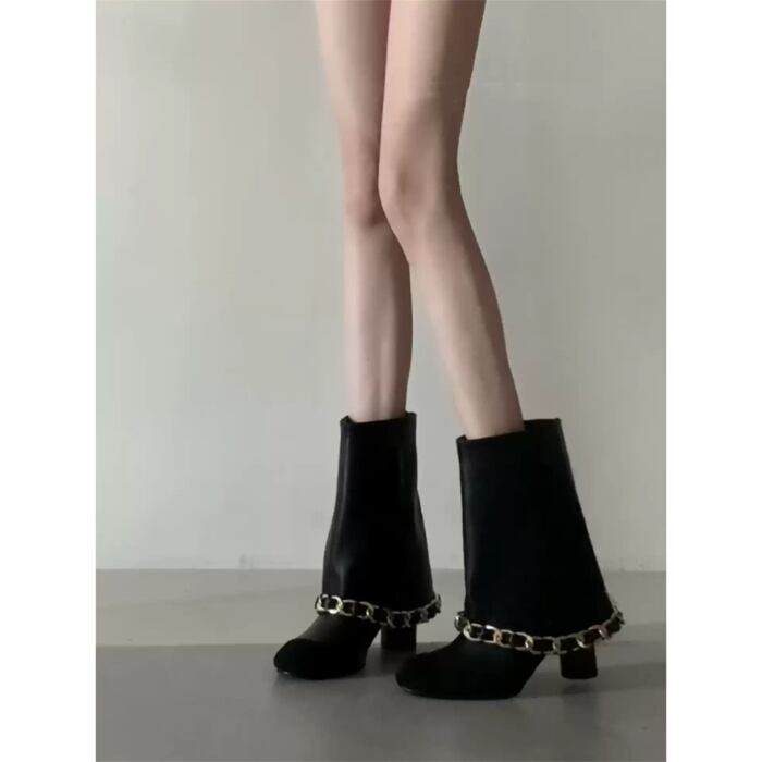 シンプルになりがちなブラックブーツに、重厚感のあるゴールドチェーンを大胆にプラス。強さと色気をあわせ持つ、洗練された**「大人ギャル」**スタイルを完成させる一足です。