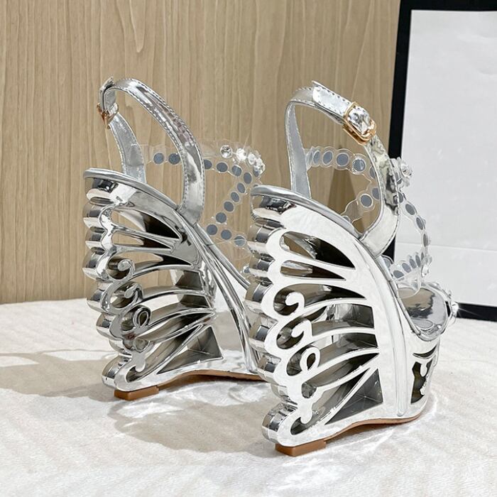 歩くたびに光を反射するシルバーエナメルと、芸術的なカットワークヒールが融合。強気な華やかさと洗練された色気を放つ、まさに**「大人ギャル」**のための勝負サンダルです。