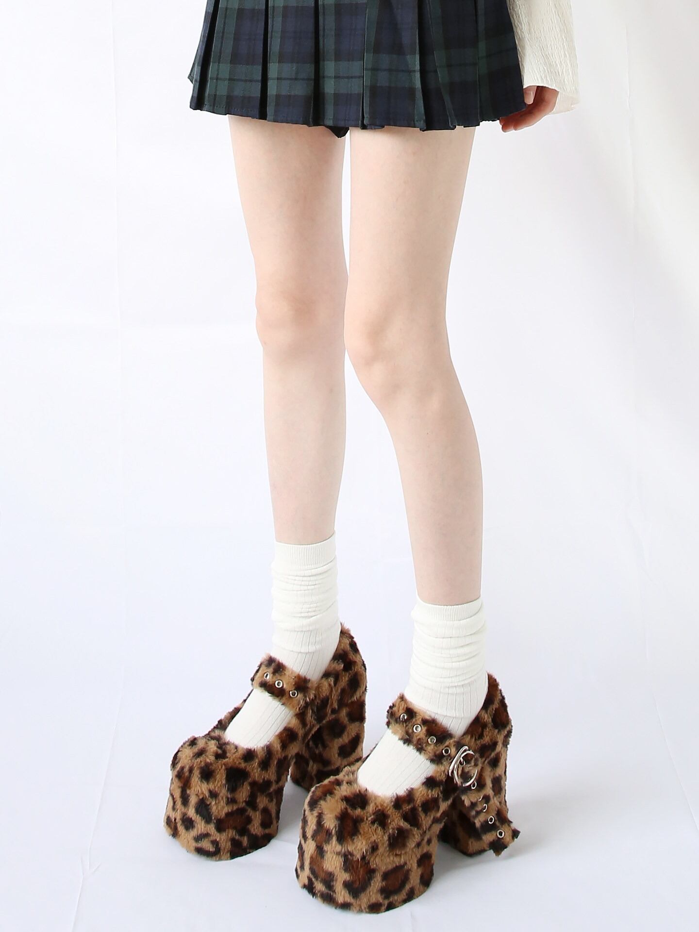 全面を柔らかなファーで包み込んだ、インパクト絶大の厚底メリージェーン。