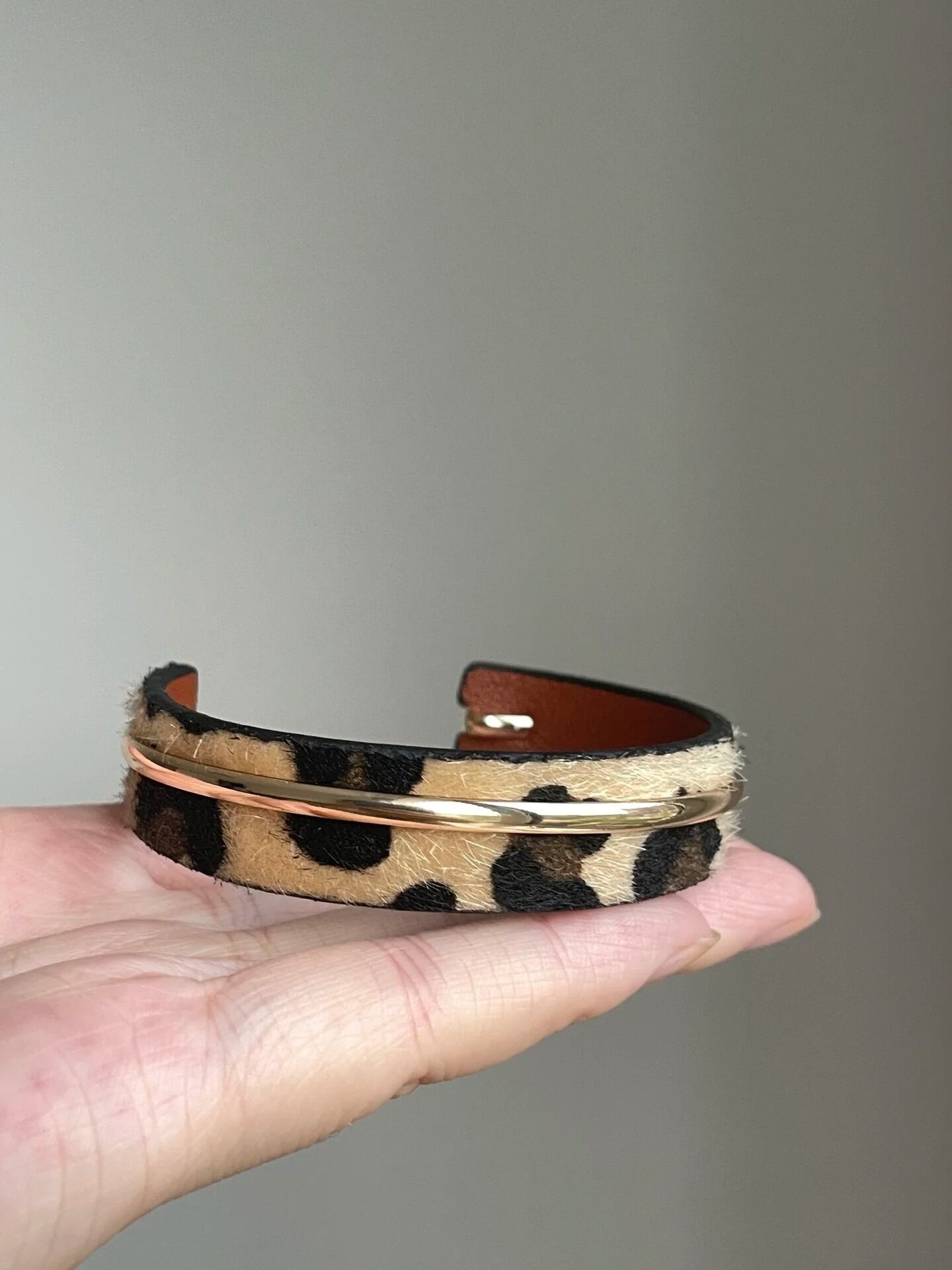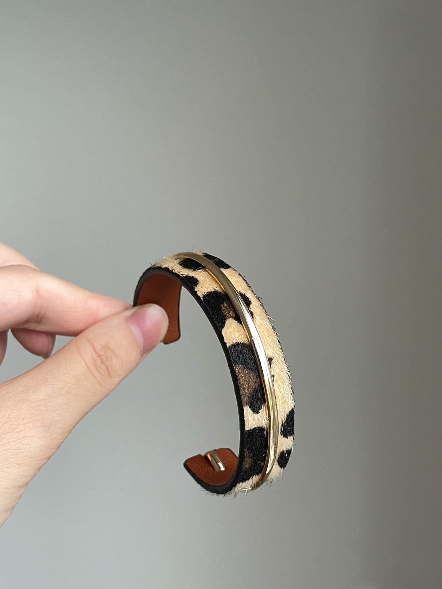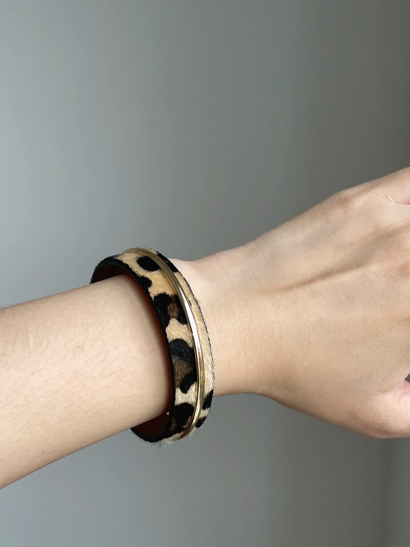 秋冬のムードを盛り上げるレオパード柄のハラコ調素材に、洗練されたゴールドラインをプラスしたバングル。
