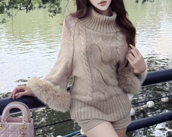 袖ボリュームファー・タートルケーブルニット M3 -0172