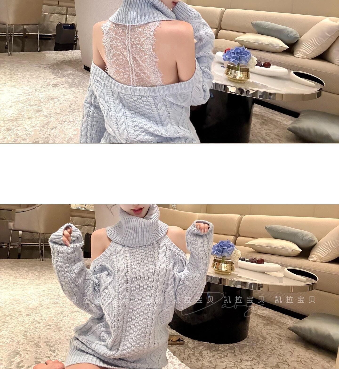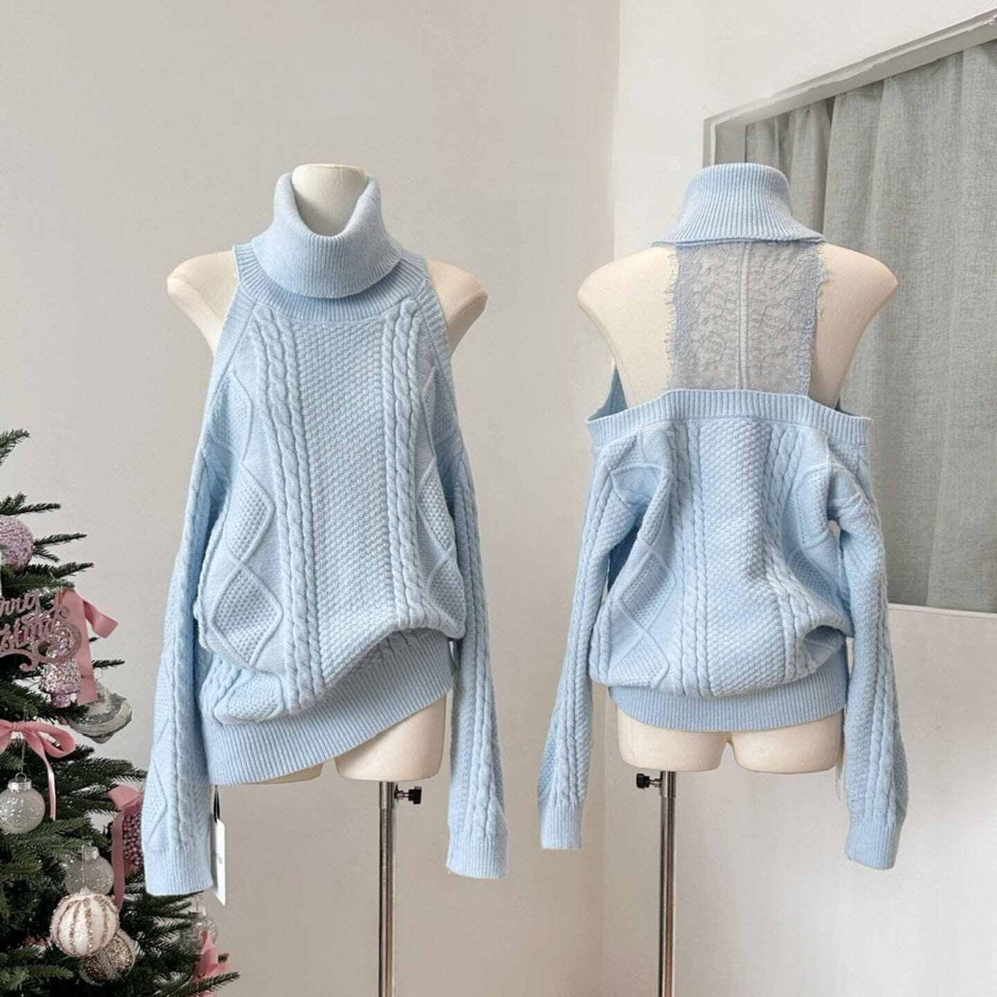 フロントは上品なケーブル編みのタートルニット。しかし振り返れば、背中一面に広がる繊細なレースと大胆なオープンデザイン。この「ギャップ」こそが、大人ギャルの真骨頂です。