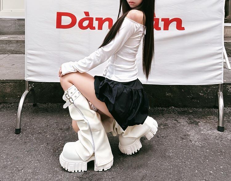 トレンドのレッグカバーと、タフな厚底ショートブーツがセットになったハイエンドな一足。