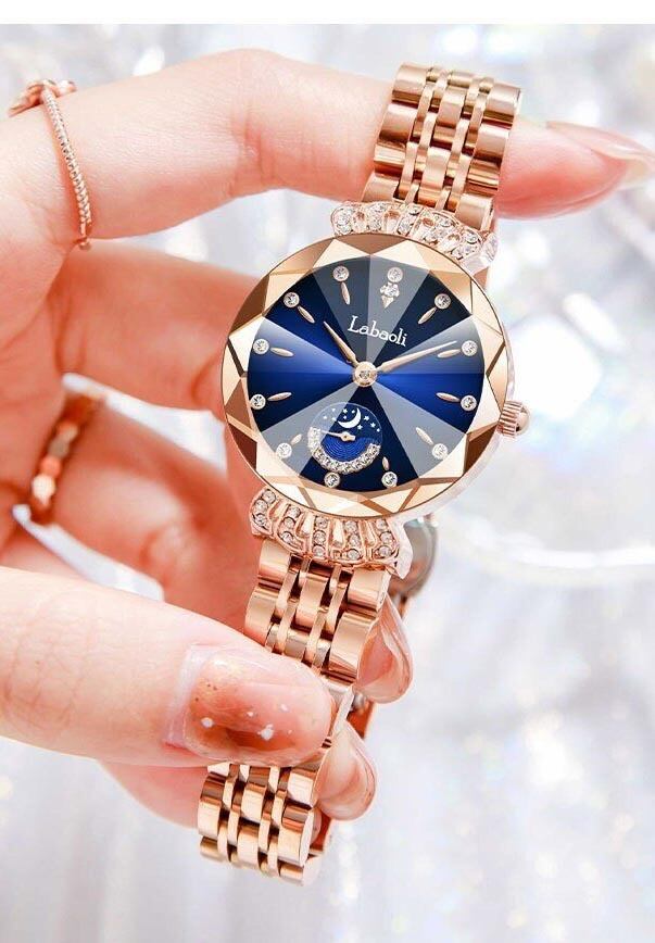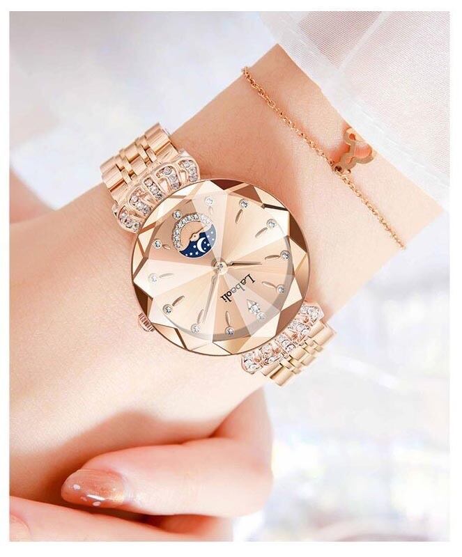 昼夜で表情を変えるサン&ムーン機能と、散りばめられたビジューが、大人の女性の品格と色気を引き立てます。風防にダイヤモンドのようなカッティングを施し、どの角度から見てもキラキラと輝きを放ちます。