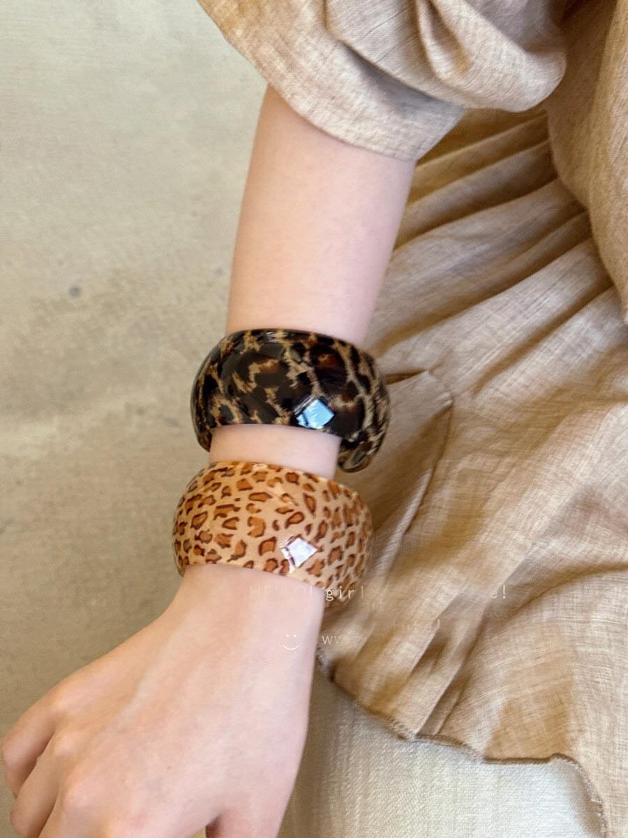 存在感のあるワイドなシルエットと、艶やかなクリア素材にレオパード柄を閉じ込めた、インパクト抜群のバングルが登場。シンプルなコーデに一点投入するだけで、一気に垢抜けた「大人ギャル」なムードを演出します。