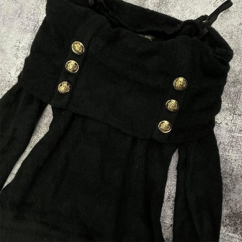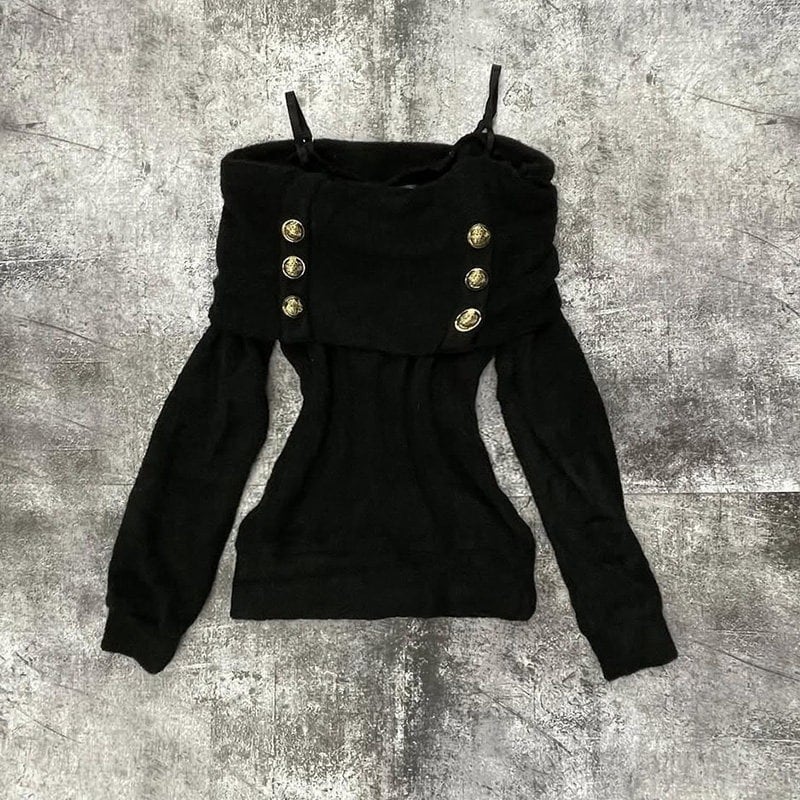 オフショルとキャミソールが一体になったデザインで、ズレを気にせず完璧な「肩見せ」をキープできます。フロントに並んだ装飾ボタンが、ブラックの生地に映えて高級感をプラス。シンプルになりがちな秋冬コーデを一気にゴージャスに格上げしてくれます。