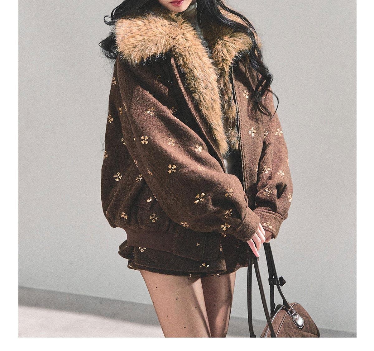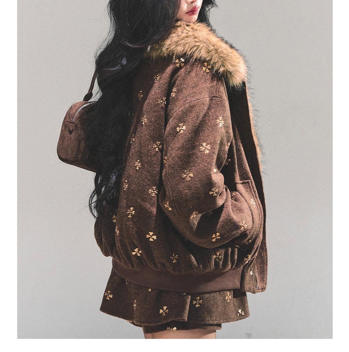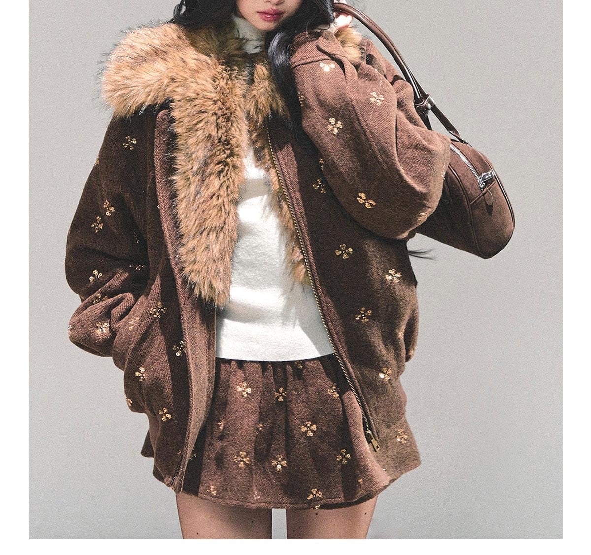 カジュアルなジップアップタイプのアウターは、ボリューム感のあるファー襟で圧倒的な小顔効果とラグジュアリーな雰囲気を演出。セットのミニスカートと合わせることで、女性らしいシルエットを強調し、エッジの効いた「大人ギャル」スタイルがこれ一着で完成します。