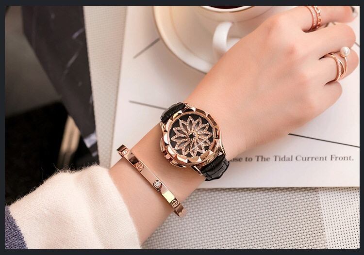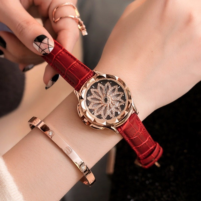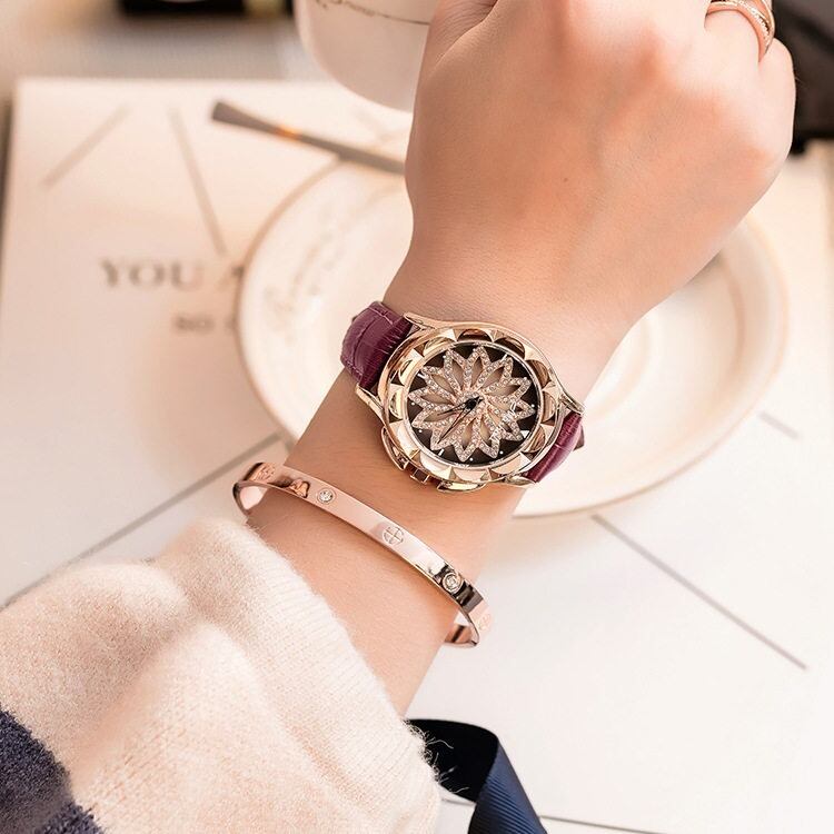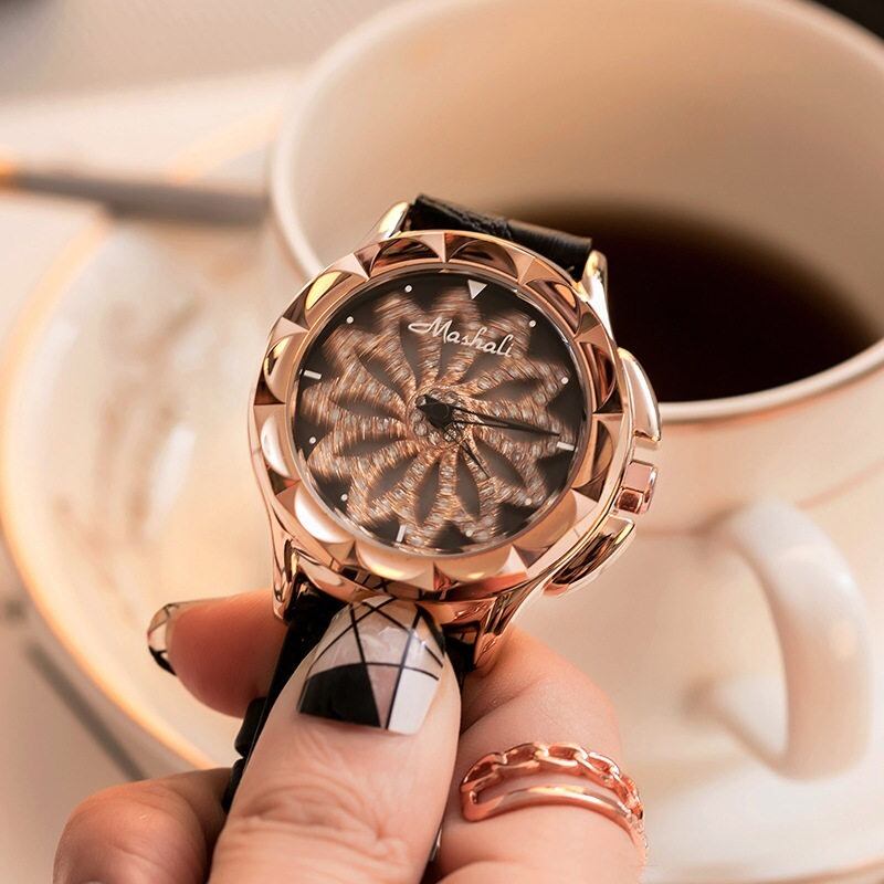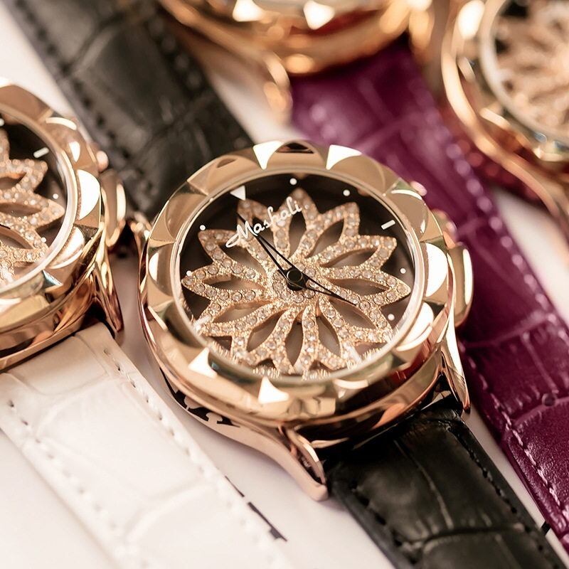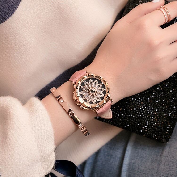 遊び心あふれる回転ギミック:中央のフラワーモチーフが、腕の動きに合わせてスムーズに回転。他にはないユニークなデザインで、会話のきっかけにもなる主役級アイテムです。