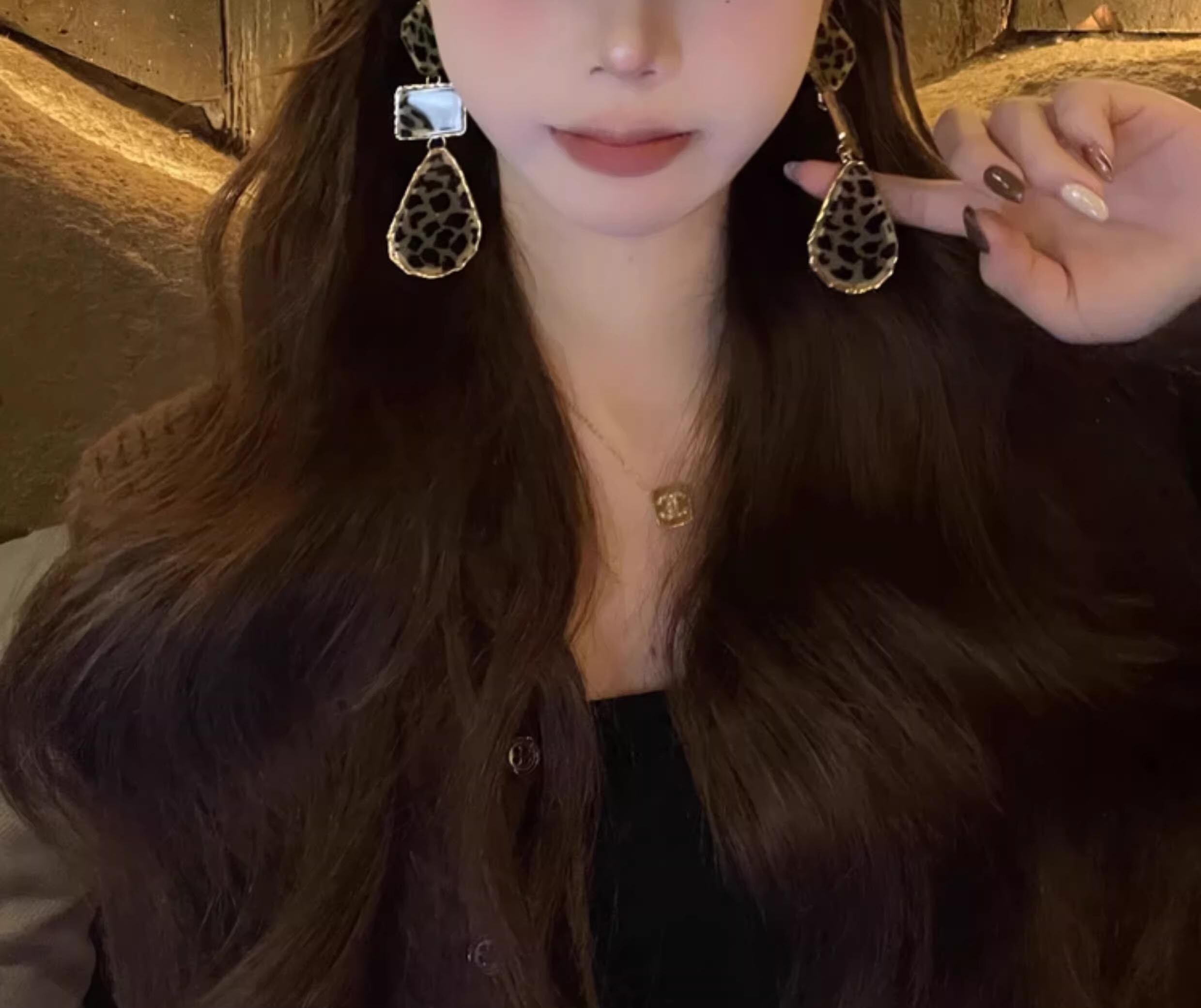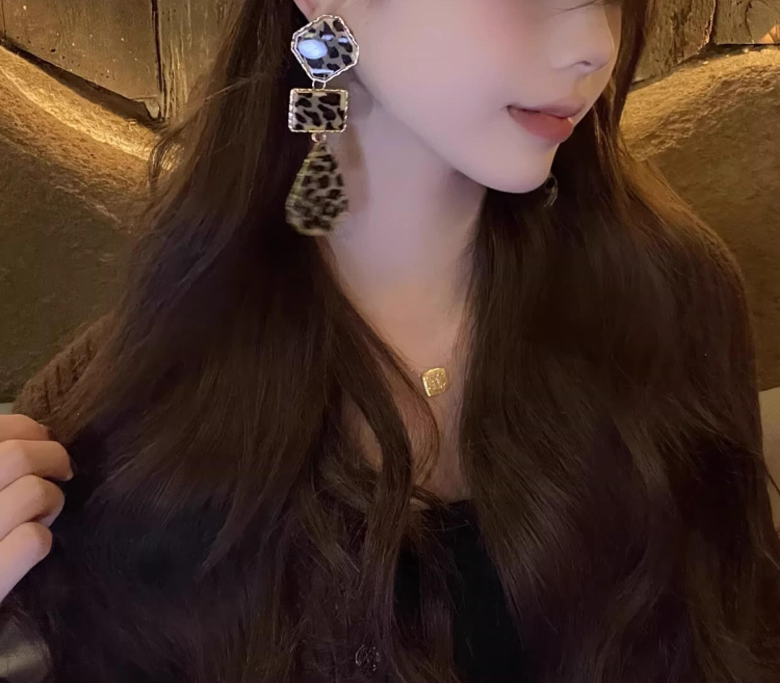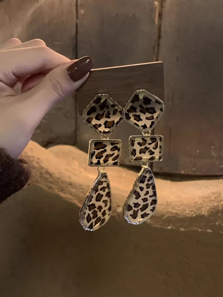スクエア・レクタングル・ドロップの3種の幾何学フォルムを繋げた、圧倒的な存在感を放つレオパードピアス。