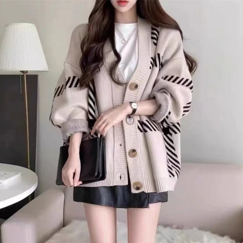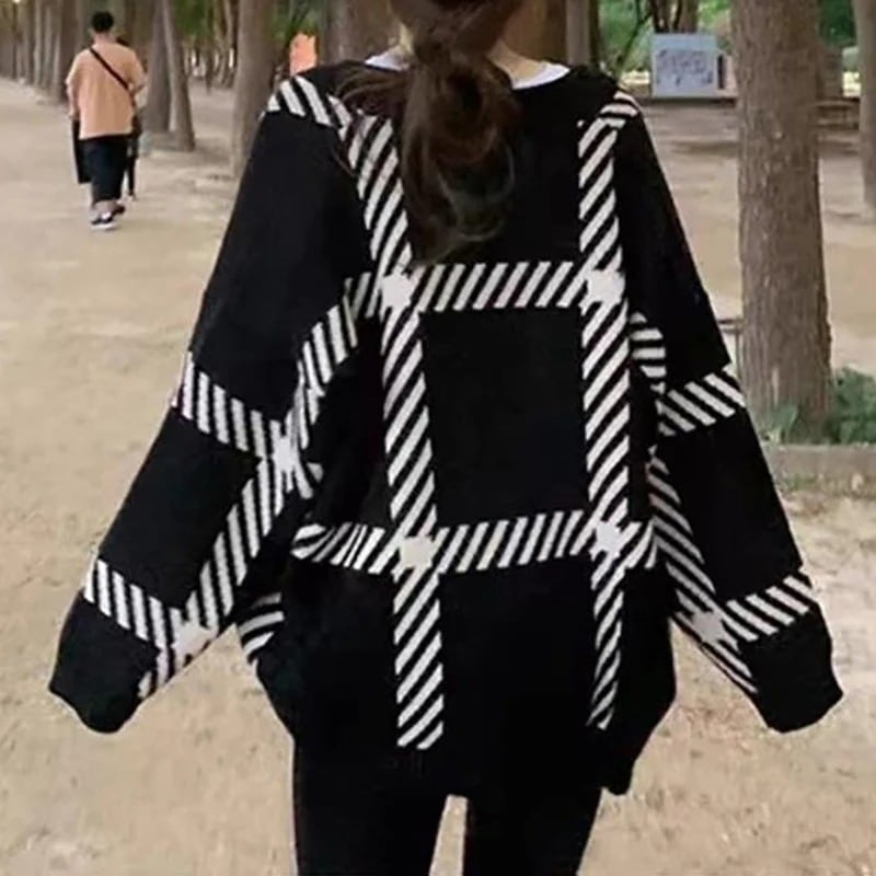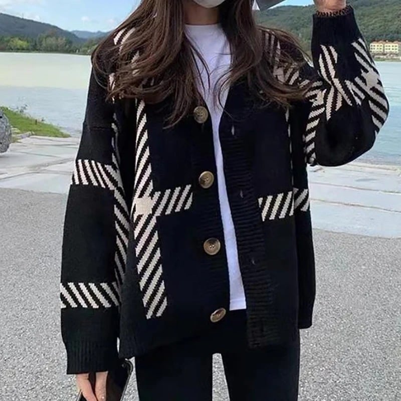 〈2Color〉オーバーサイズ チェック柄 Vネックカーディガン M3 -0001