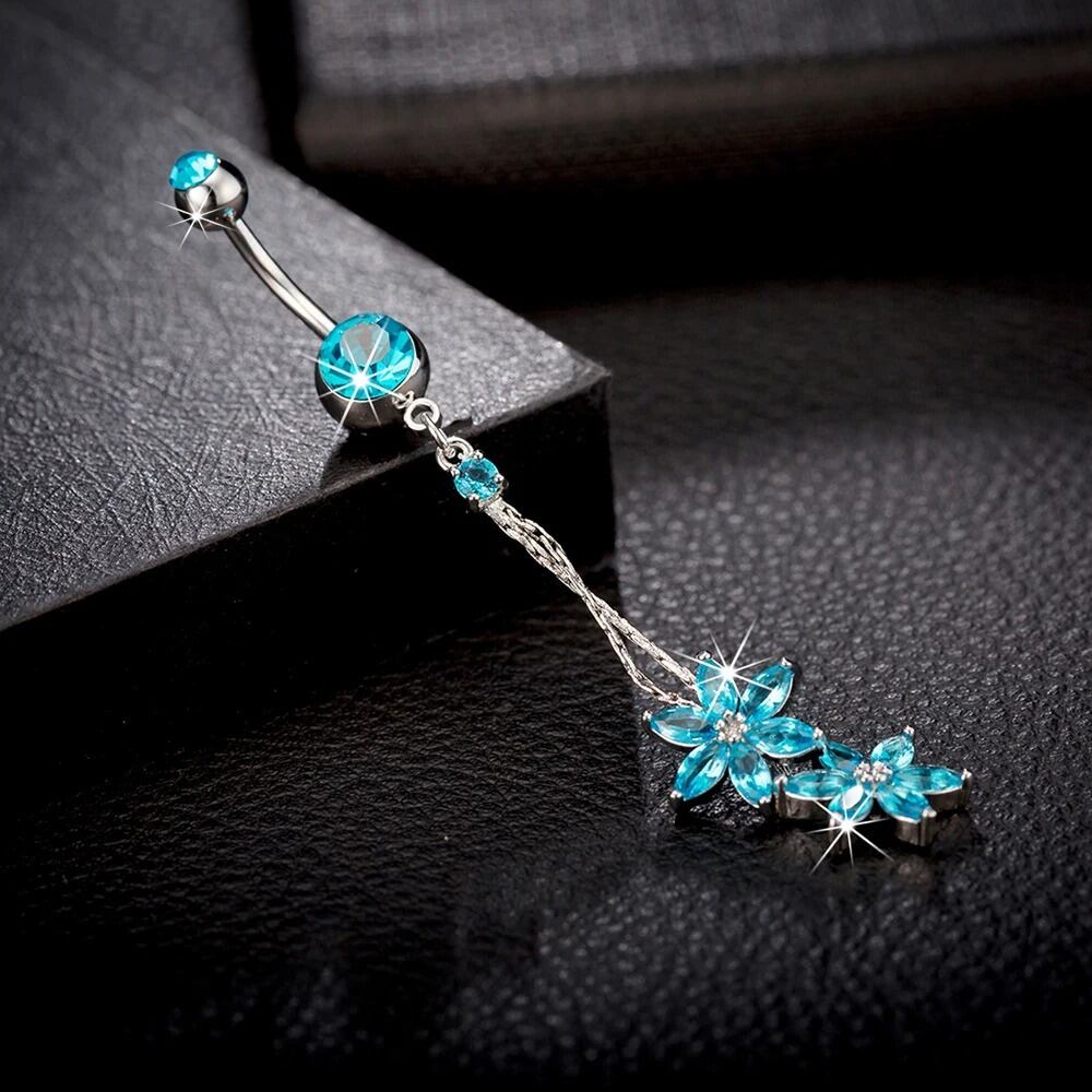 歩くたびにゆらゆらと揺れる、繊細なロングチェーンと2つのフラワーモチーフが目を惹くへそピアスです。