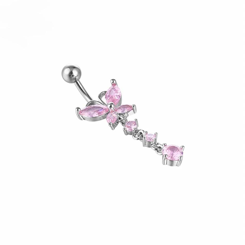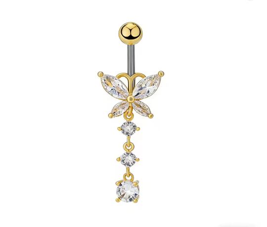 輝くバタフライモチーフに、揺れる3連のビジューをあしらった贅沢なへそピアス。