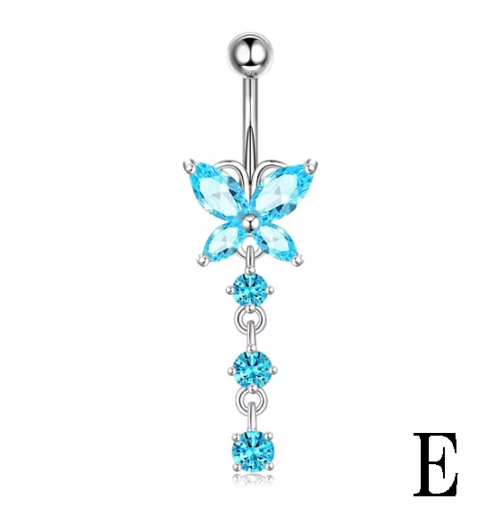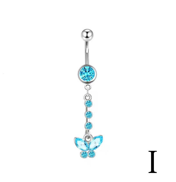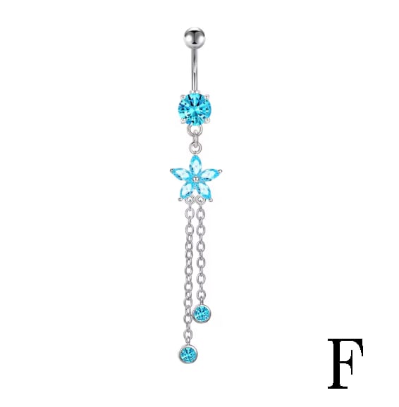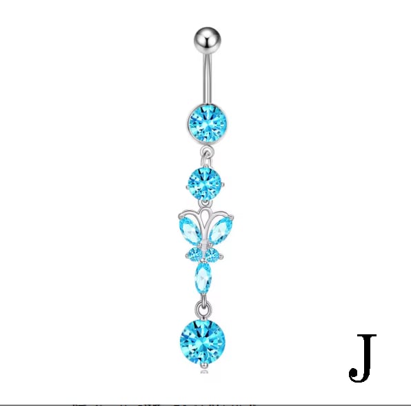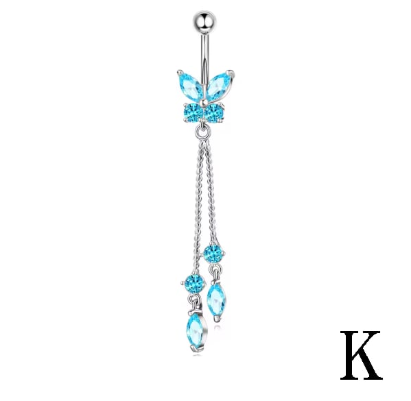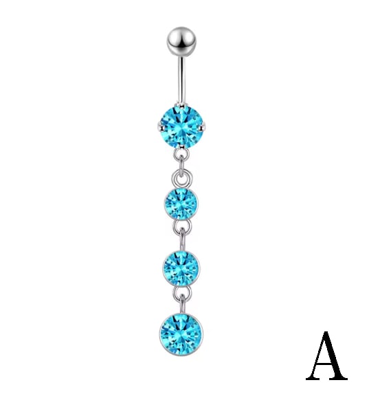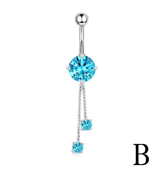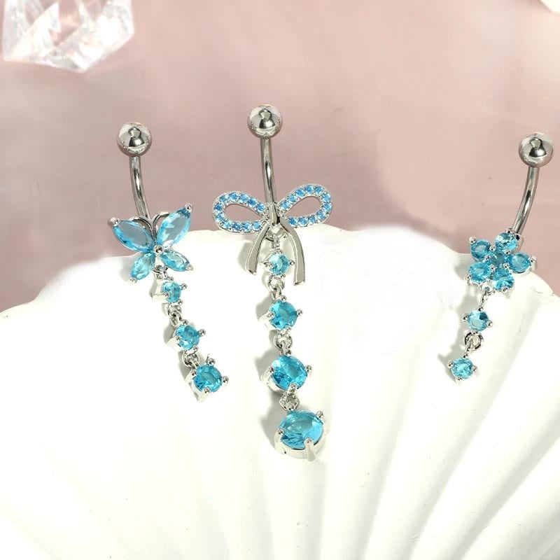 視線を釘付けにする、圧倒的な存在感。鮮やかなアクアブルーのキュービックジルコニアを贅沢に使用した、揺れるデザインのへそピアスです。