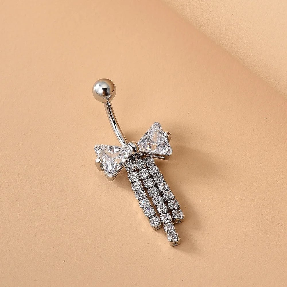 立体的なリボンモチーフに、贅沢な3連のストーンフリンジを組み合わせた、圧倒的な存在感を放つへそピアスです。