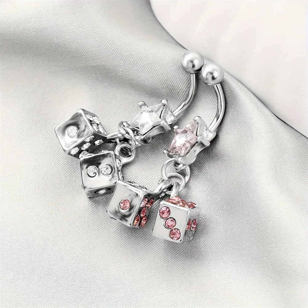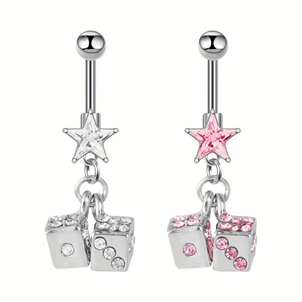 煌めくスターパーツの下で、ラインストーンを贅沢にあしらったダブルダイスが動くたびに揺れ、へそ出しルックの存在感を格上げします。