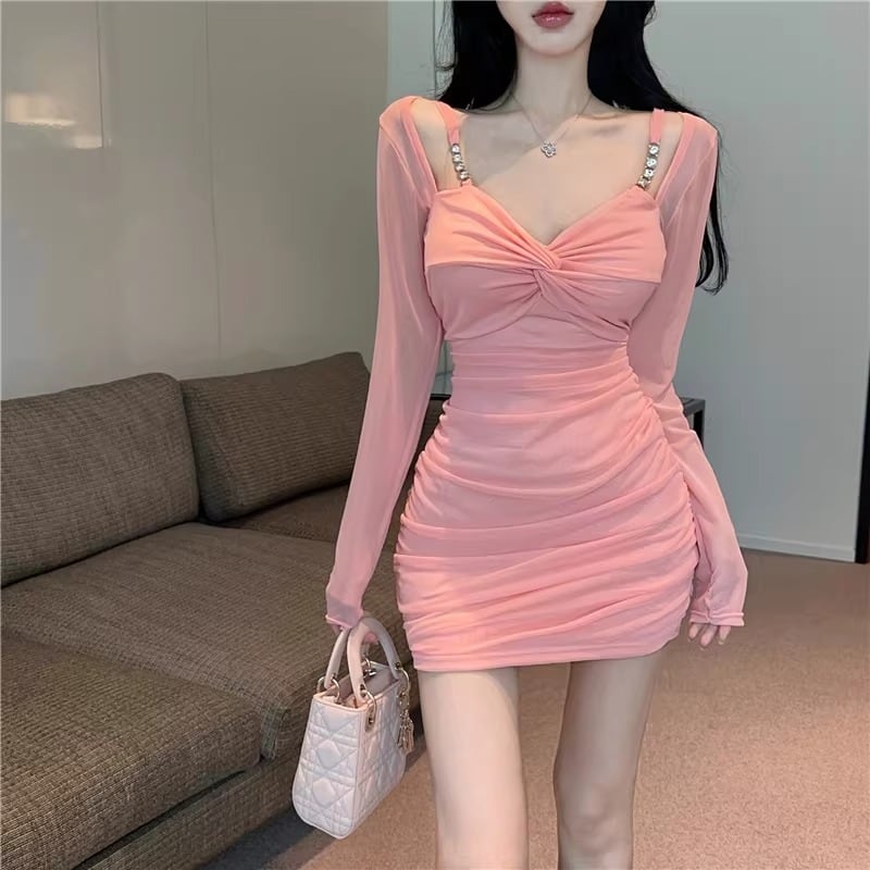 〈3Color〉シアースリーブ切替 ギャザータイトドレス ビジューアクセント M3 -0354