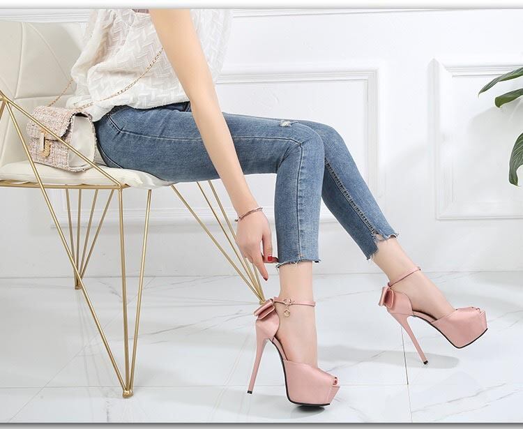 洗練されたサテン調の光沢が、足元をラグジュアリーに演出。高めのピンヒールと厚めのプラットフォーム(前厚)で、驚きの脚長効果と安定感を両立させました。