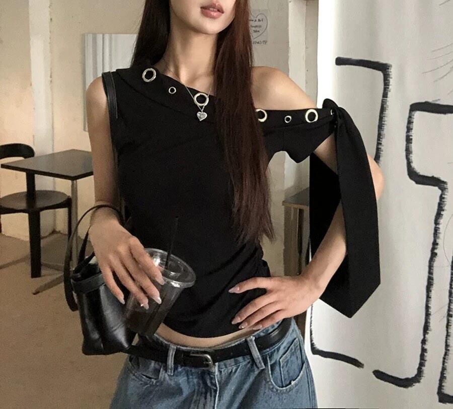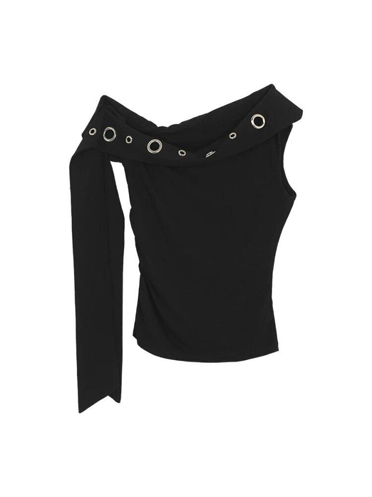 大胆なアシンメトリーラインと、大小のハトメ装飾が目を引く主役級のワンショルダートップスです。