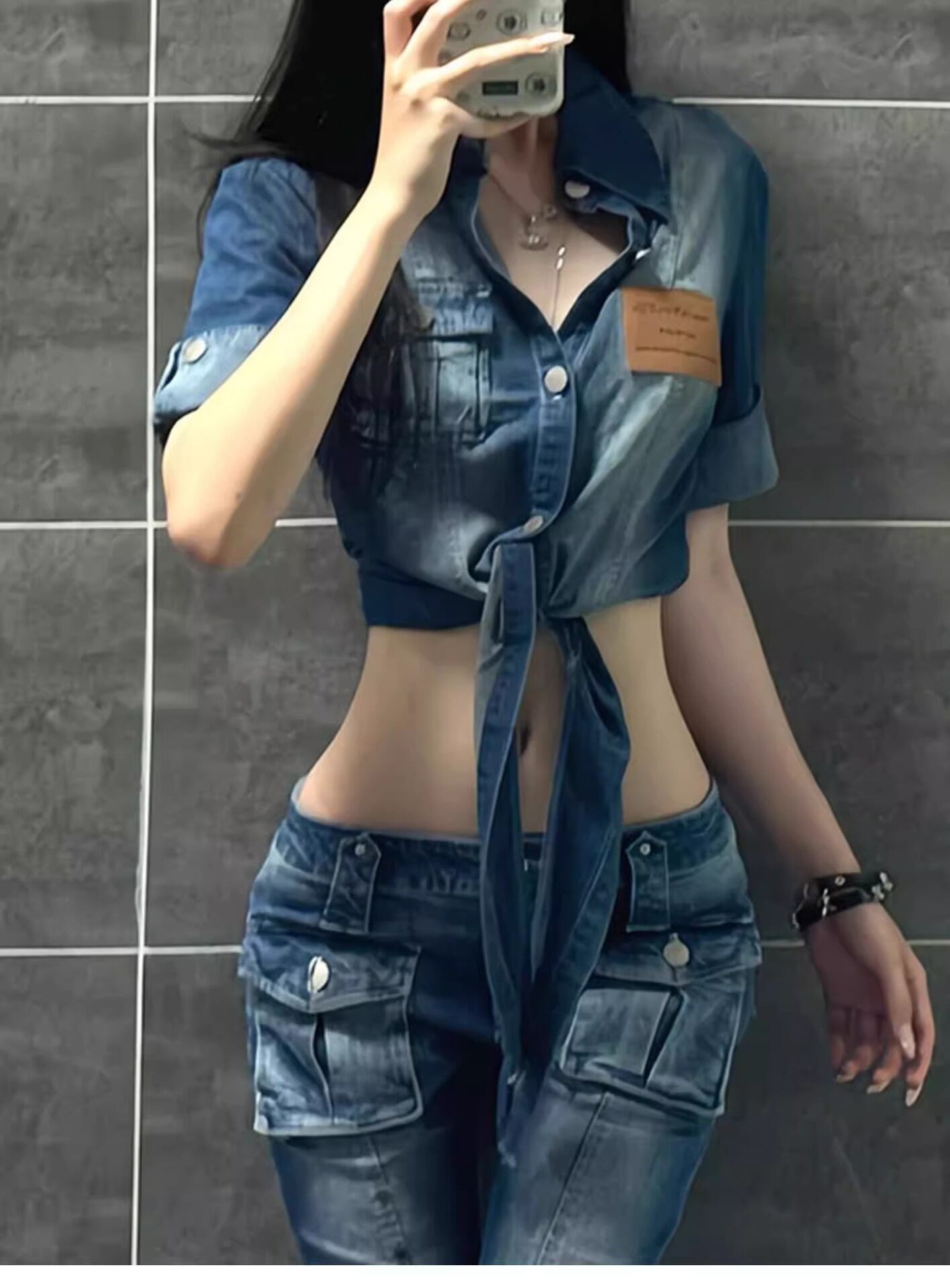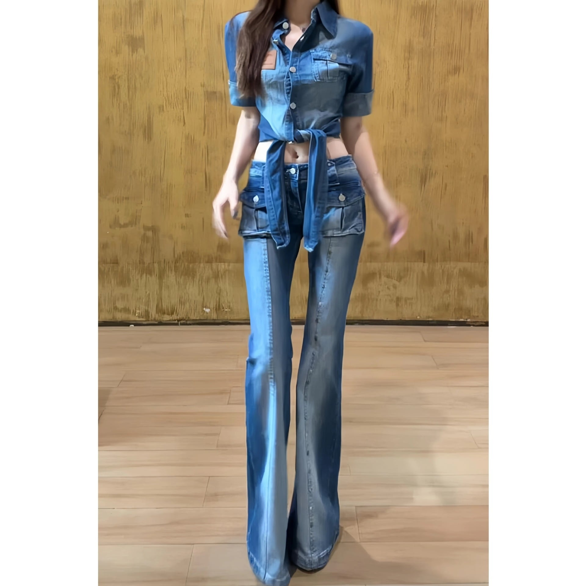 大胆なウエスト見せのクロップドシャツと、膝下から広がる美脚フレアパンツの組み合わせは、大人ギャルならではの「強めストリート」を完璧に体現します。