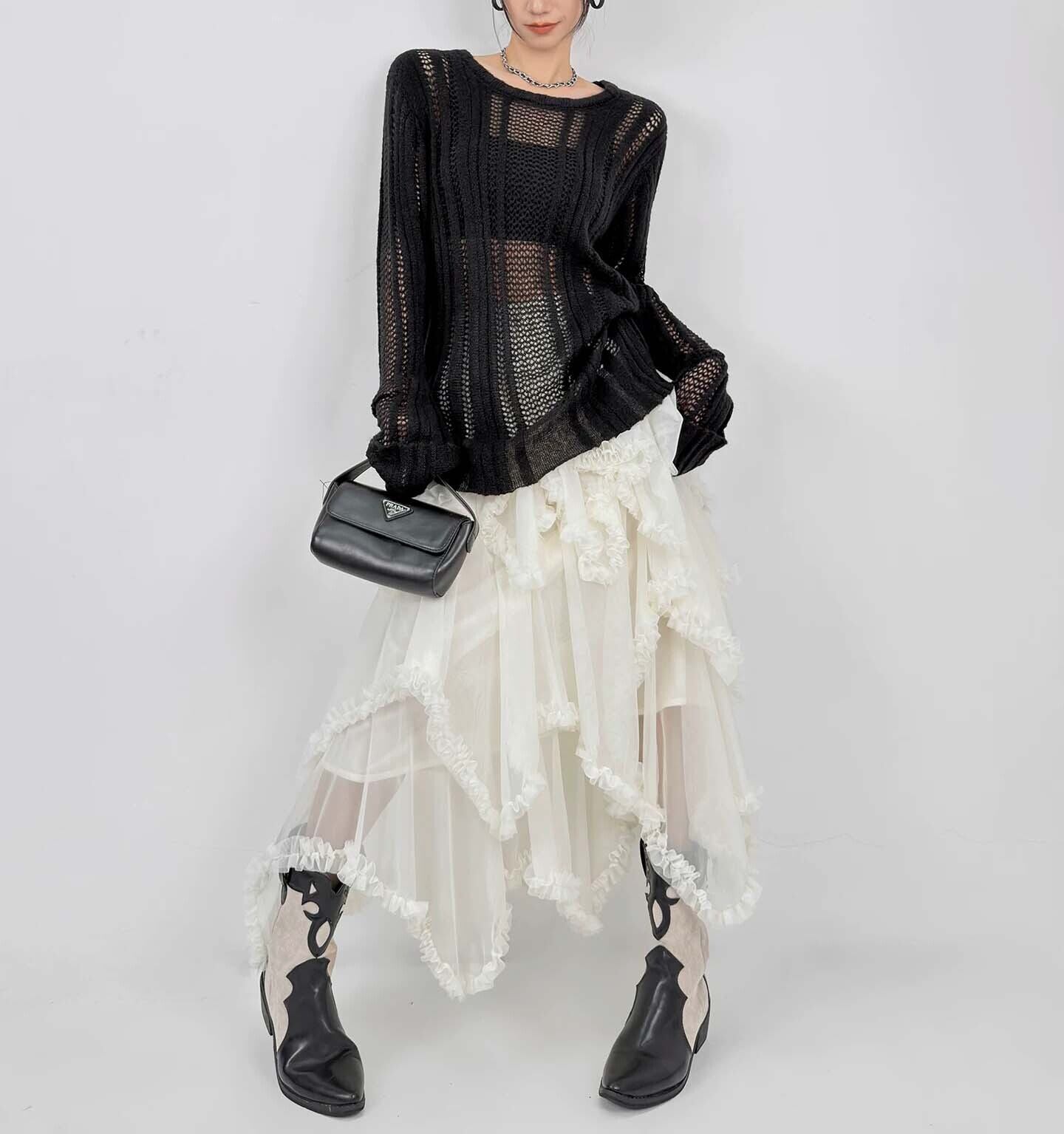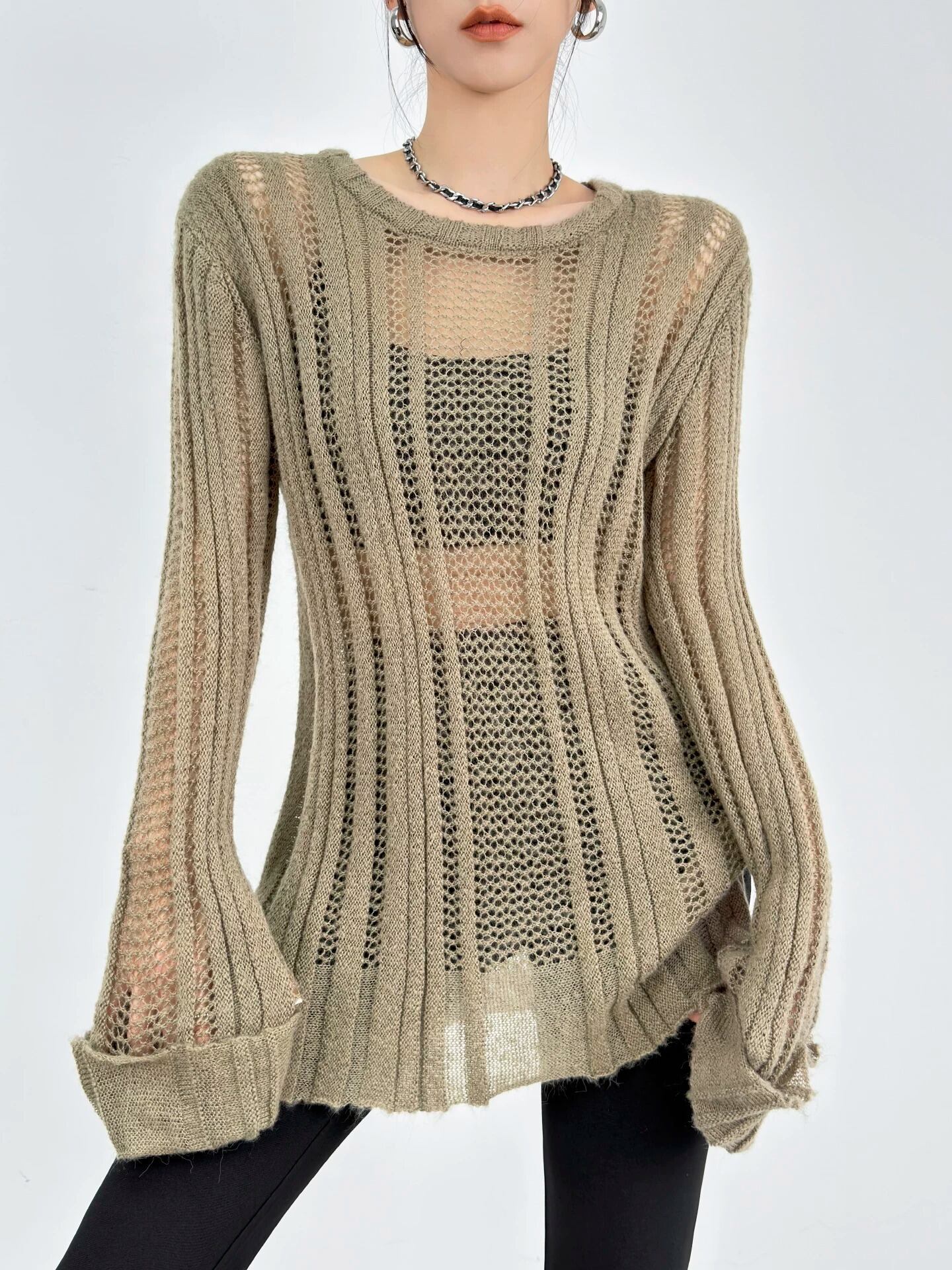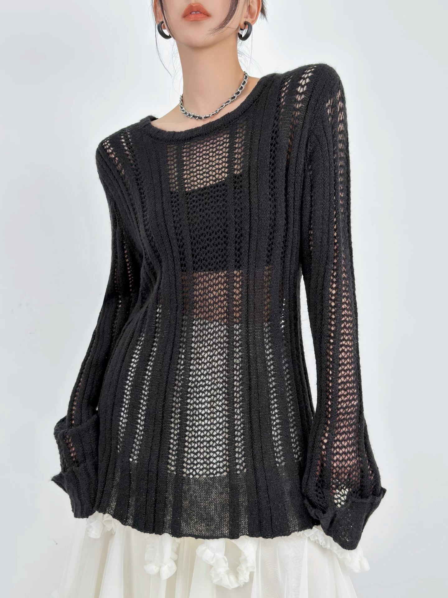 トレンドの透け感を存分に楽しめる、繊細な透かし編みのニットプルオーバーが登場。
