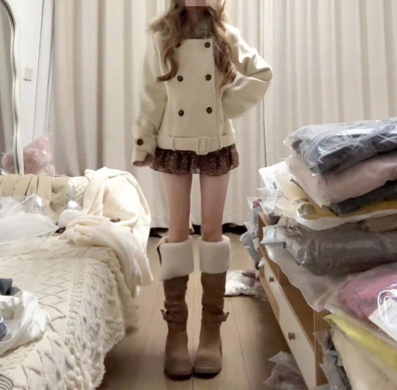 冬のコーディネートを華やかに彩る、アイボリーカラーのショート丈ピーコート。ウエスト部分のベルトディテールがアクセントになり、ショート丈ながらもメリハリのあるシルエットを演出します。ミニ丈のボトムスとの相性が抜群で、トレンドの大人ギャルスタイルやフェミニンコーデの仕上げに最適なアウターです。