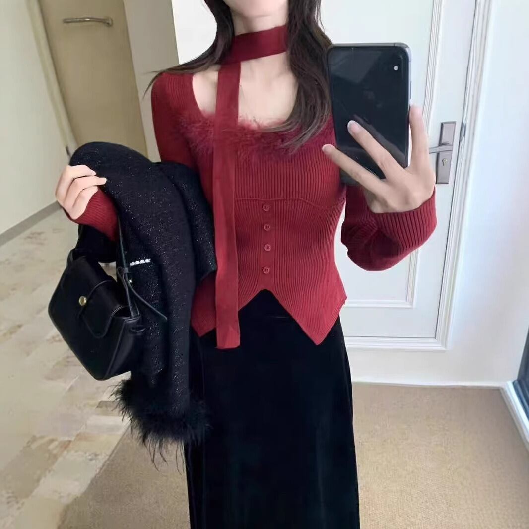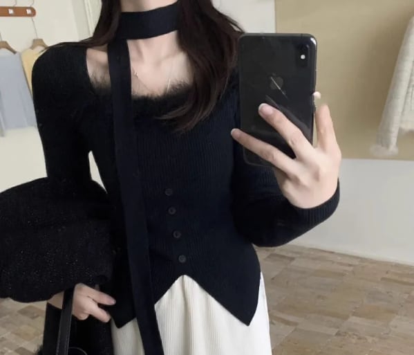 胸元の柔らかなフェザーファーと、首元を美しく彩るチョーカーデザインが目を惹くリブニット。