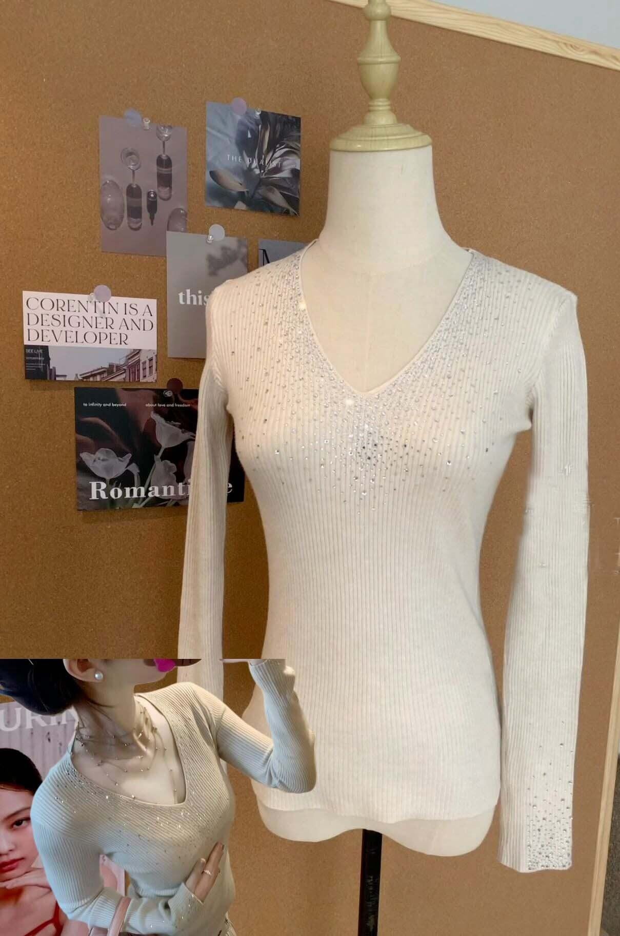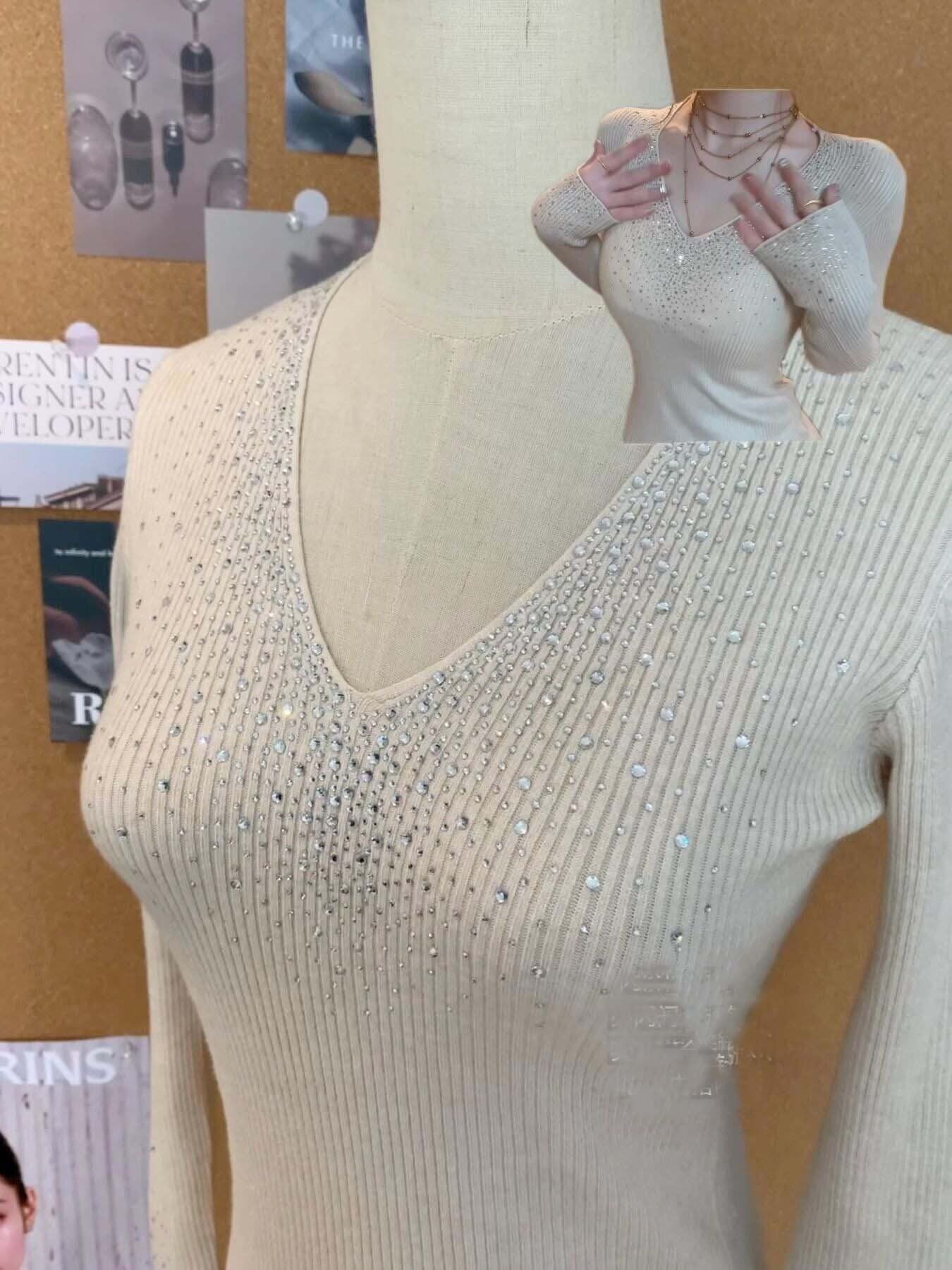 〈4Color〉ラインストーン付 Vネック スリムリブニット M3 -0609
