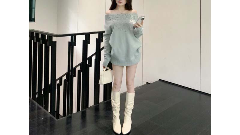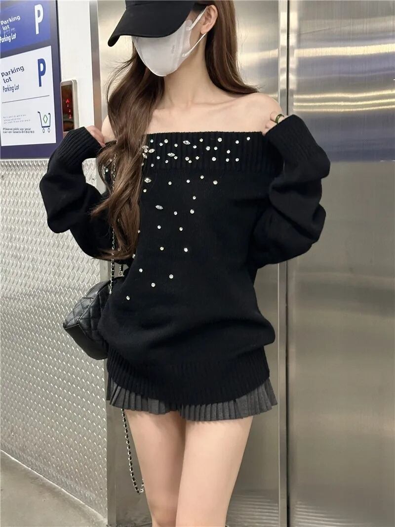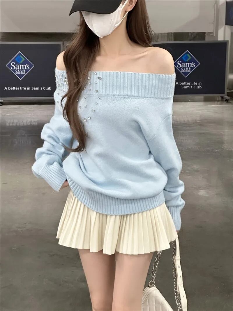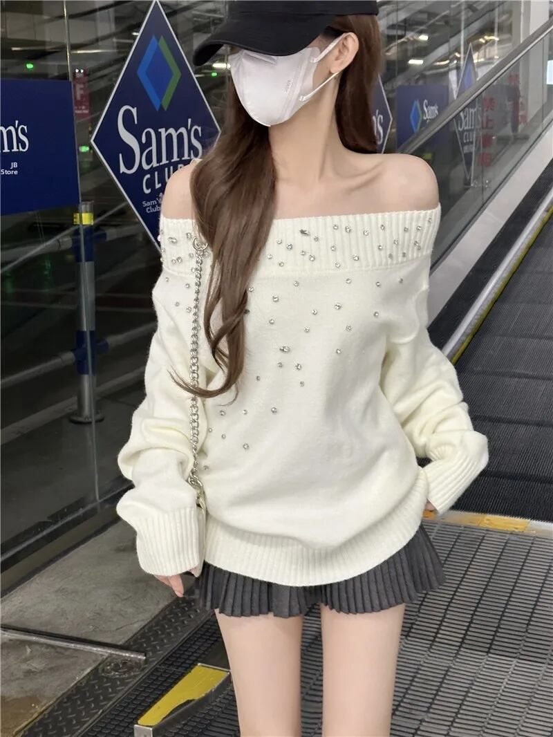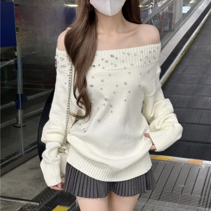 オフショル×ビジュー 華奢見えニットトップス M3 -0610