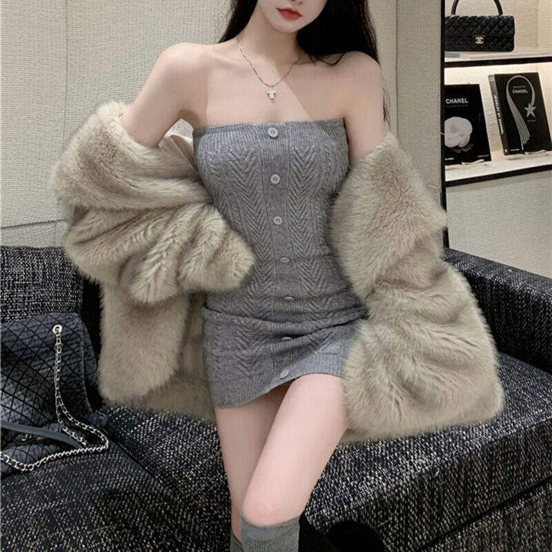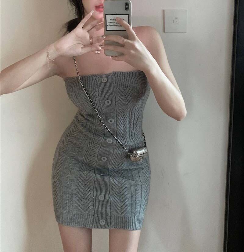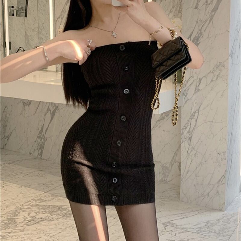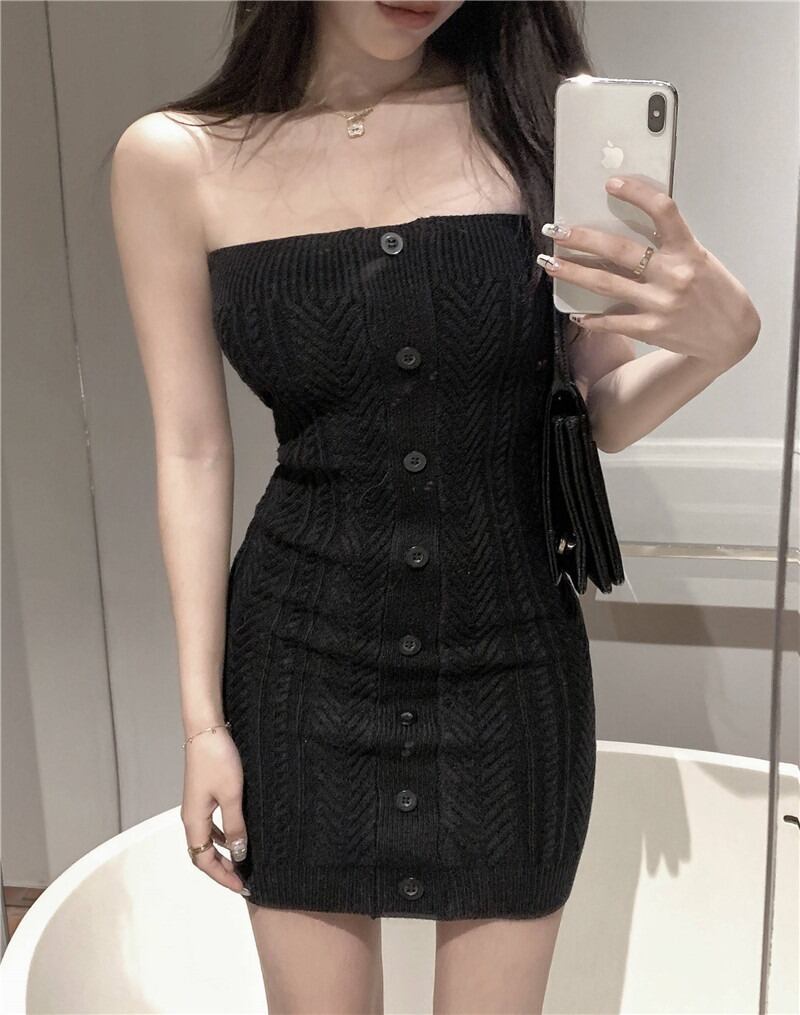 〈3Color〉フロントボタン ヘリンボーン編み チューブトップ ニットワンピース M3 -0612