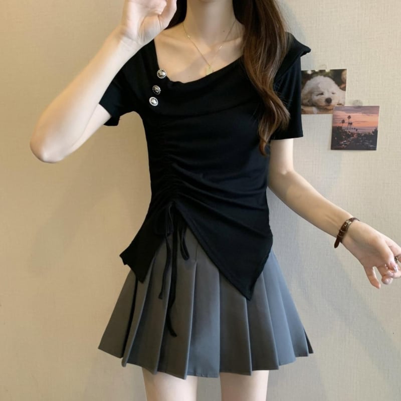 〈3Color〉ドレープネックアクセントボタンシャーリングトップス M1-0050