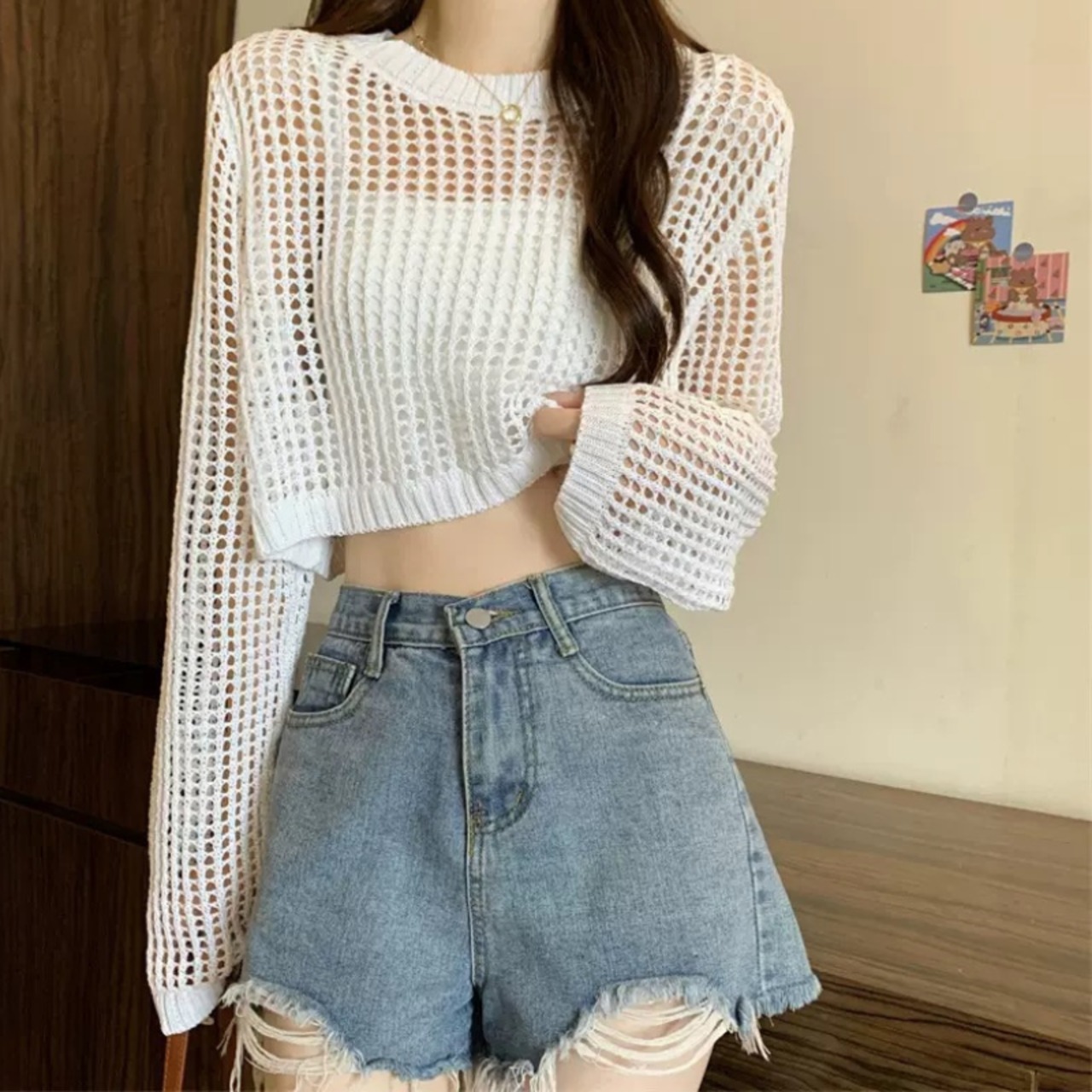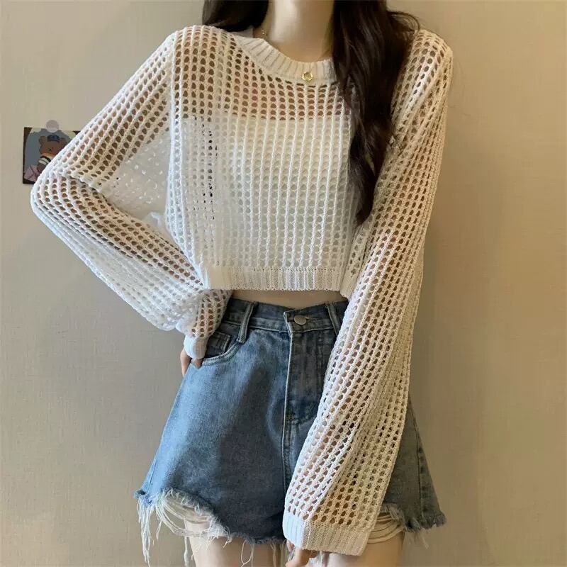 プルオーバーショート丈メッシュニットは、カジュアルなスタイルにぴったりの一枚です。