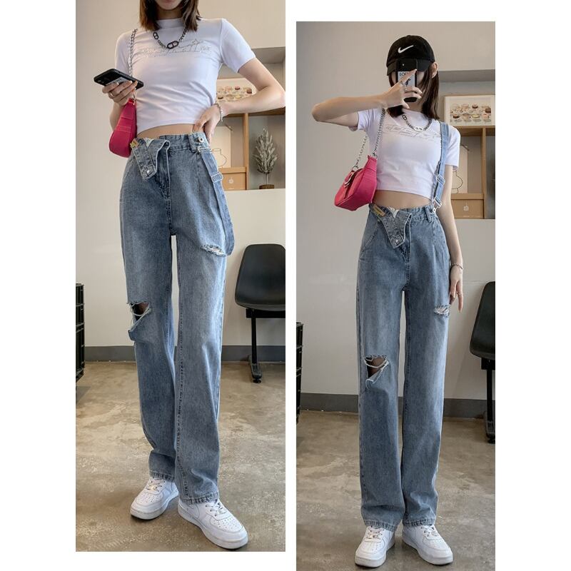 スタイリッシュで個性的なダメージカット2wayストラップデニムパンツ。