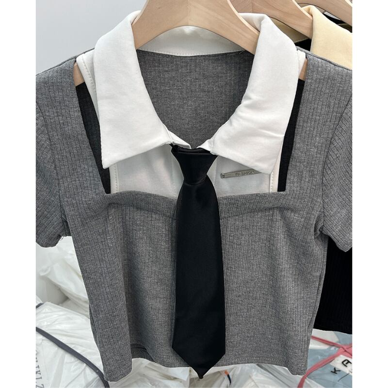 このフェイクレイヤードネクタイ付きポロトップスは、手間いらずでおしゃれなレイヤードスタイルが楽しめるアイテムです。