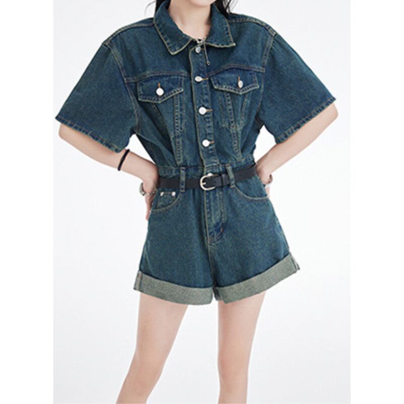 〈2Color〉ポロカラーデニムショートジャンプスーツ M1-0164