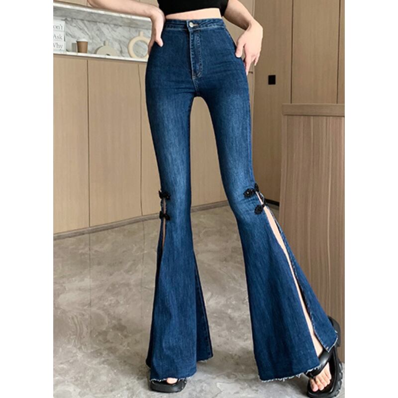 ディープスリットフレアデニムはクラシックなフレアシルエットに大胆なスリットを加えたモダンでスタイリッシュなアイテムです。