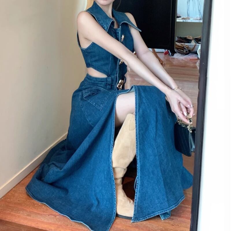 ポロカラーデニムスリットワンピースはクラシックなデザインとデニムのカジュアルさを組み合わせたスタイリッシュな一着です。