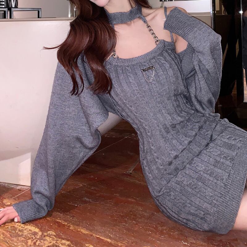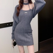 チェーンターネックニットミニワンピース+ボレロはエレガンスとトレンドを控えたホルターセットアイテムです。